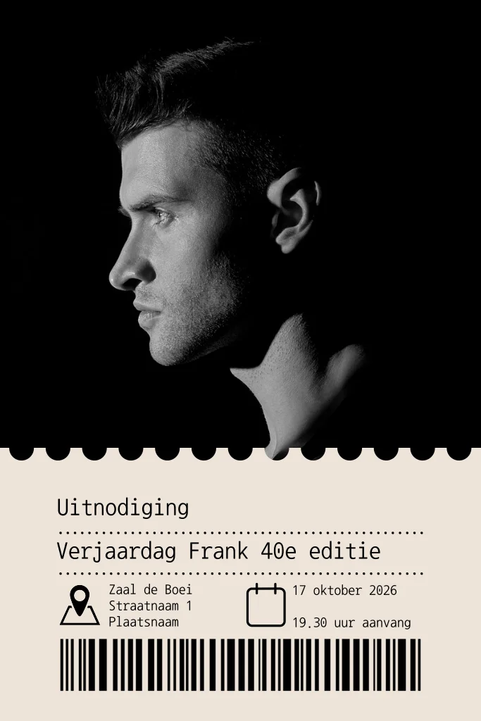 Uitnodigingskaart voor een verjaardag 40 jaar in leuk ticket vorm met foto van een man in zwart-wit. De kleur van het ticket kan worden aangepast. (24191) (Deze kaart heeft nu ronde hoeken a € 0,30 extra per kaart, in je kunt dit ook met rechte hoeken bestellen)