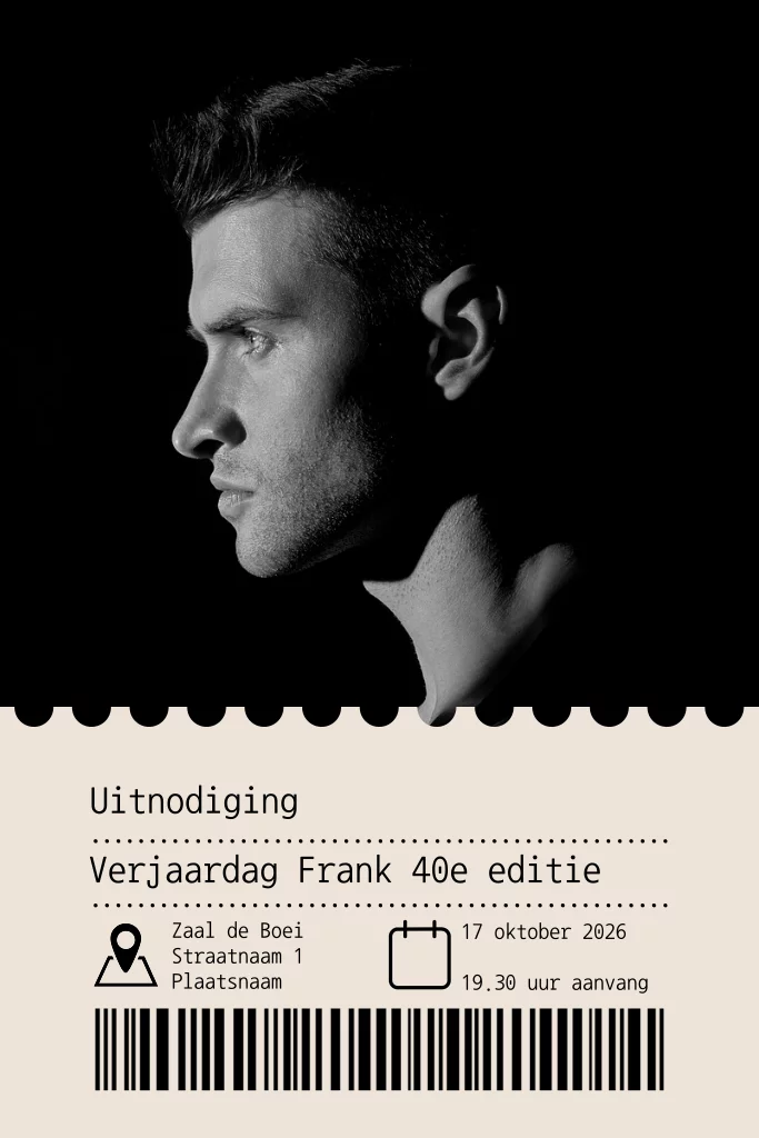 Uitnodigingskaart voor een verjaardag in leuk ticket vorm met foto van een man in zwart-wit. De kleur van het ticket kan worden aangepast. (24191) (Deze kaart heeft nu ronde hoeken a € 0,30 extra per kaart, in je kunt dit ook met rechte hoeken bestellen)