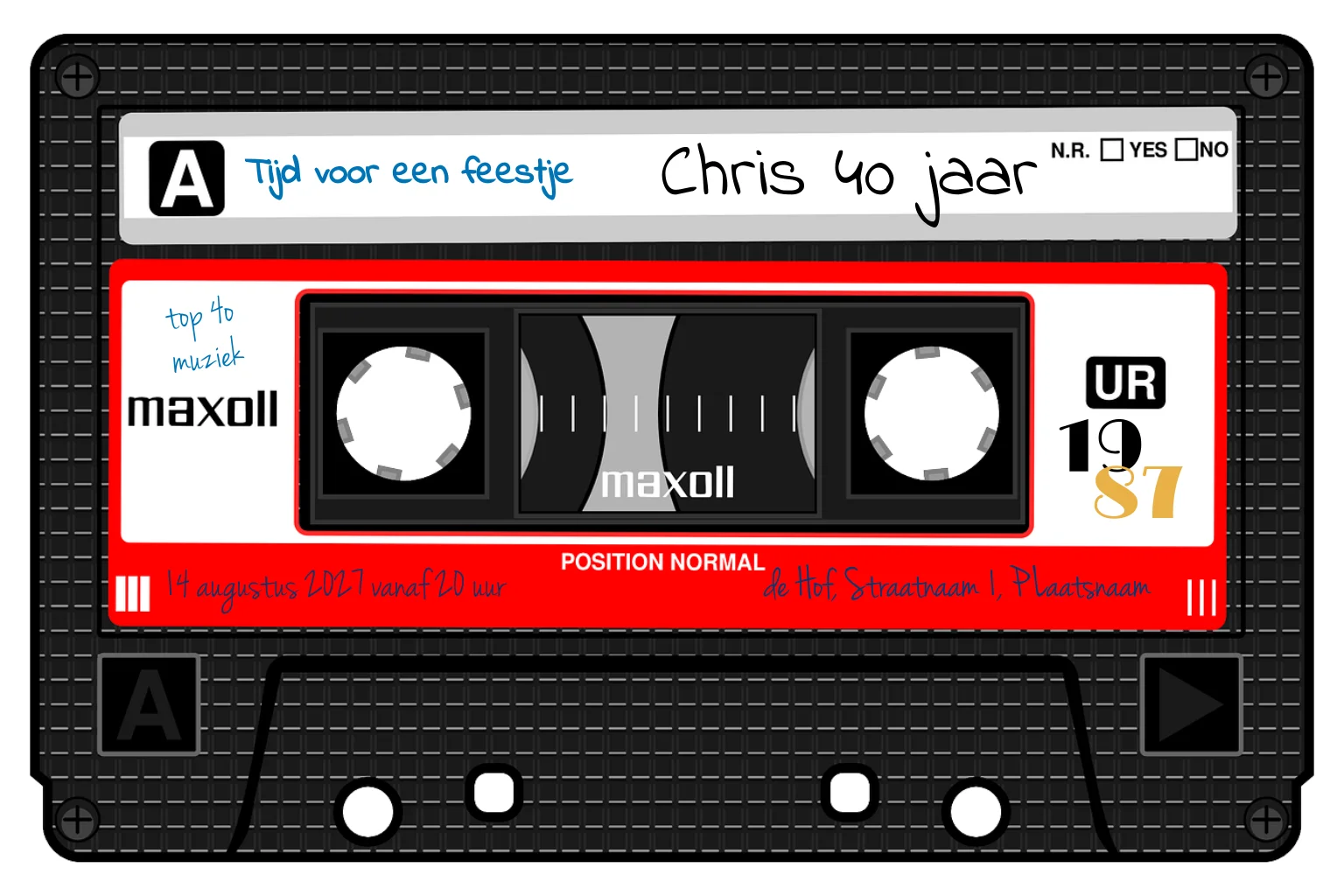 Leuke uitnodiging 40 jaar verjaardag retro stijl met een cassettebandje cassette voor een (muziek) feestje. Het jaartal is aan te passen en ook de lettertypes. Dit kan gebruikt worden voor een verjaardag maar ook een ander type feestje. (23506)