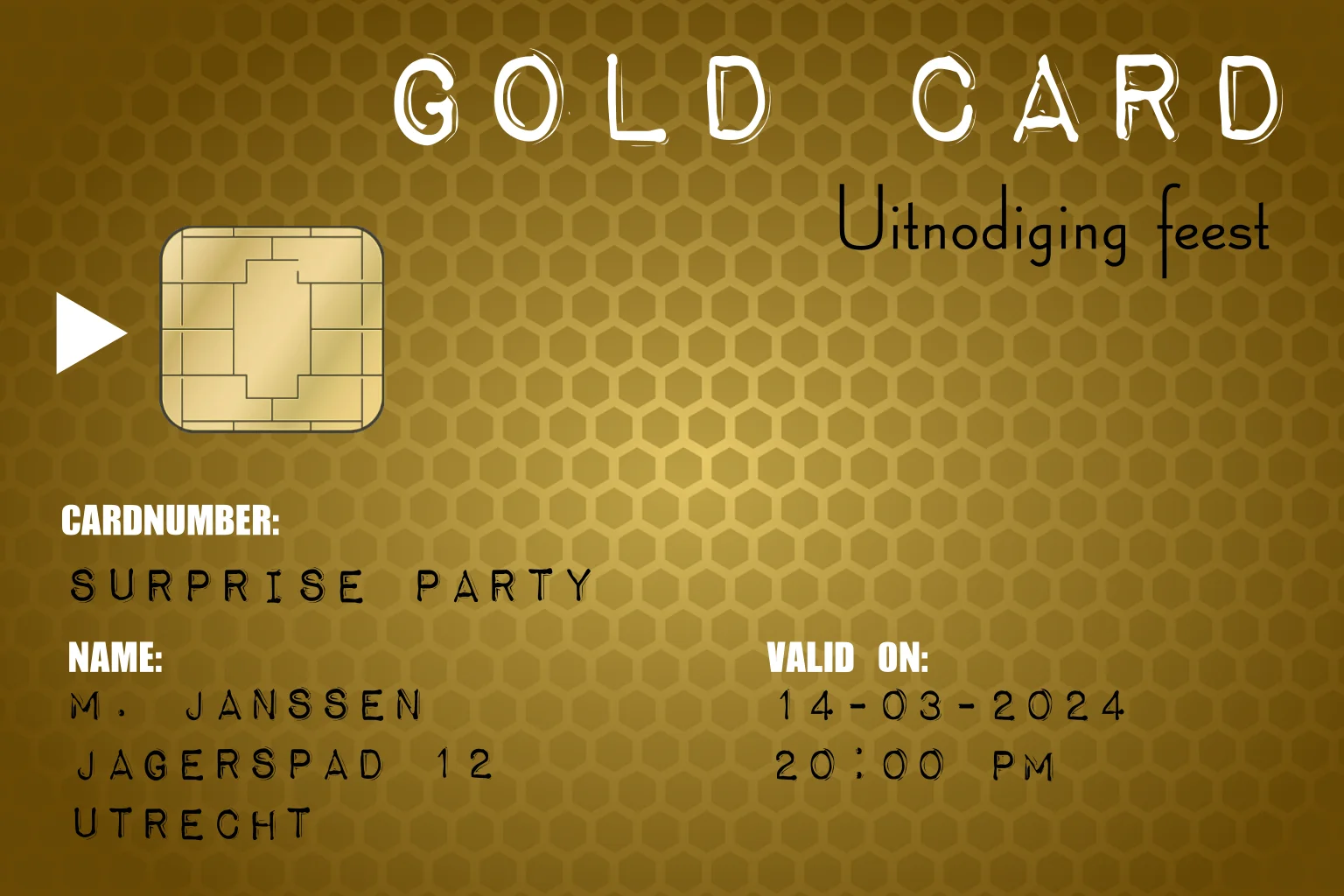 Uitnodiging verrassingsfeest feestje in de vorm van een gold card, ticket, pinpas. Grappige stijl.