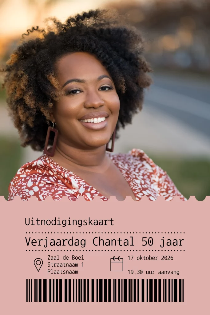 Uitnodigingskaart voor een feestje verjaardag met foto van een vrouw. De kleur van het ticket kan worden aangepast (24191) Met de toevoeging van een foto van de jarige vrouw, wordt de uitnodigingskaart nog persoonlijker en speciaal. Of het nu gaat om een glimlachende portretfoto of een leuke actiefoto, het toevoegen van een persoonlijke foto maakt de uitnodiging uniek en gedenkwaardig.