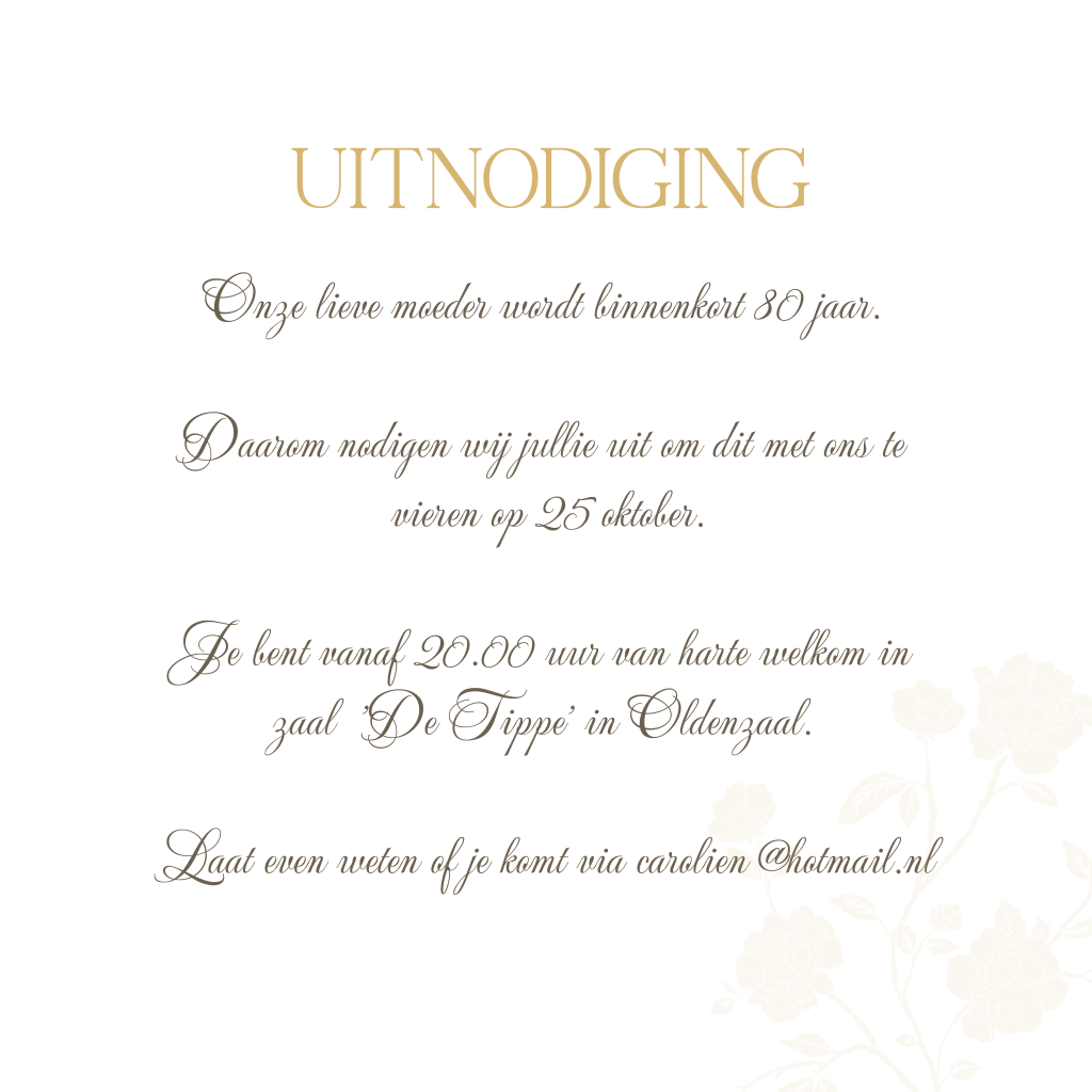 Uitnodigingskaart vrouw voor een tachtigste verjaardagsfeest. Met goudkleurige rozen. (2746)