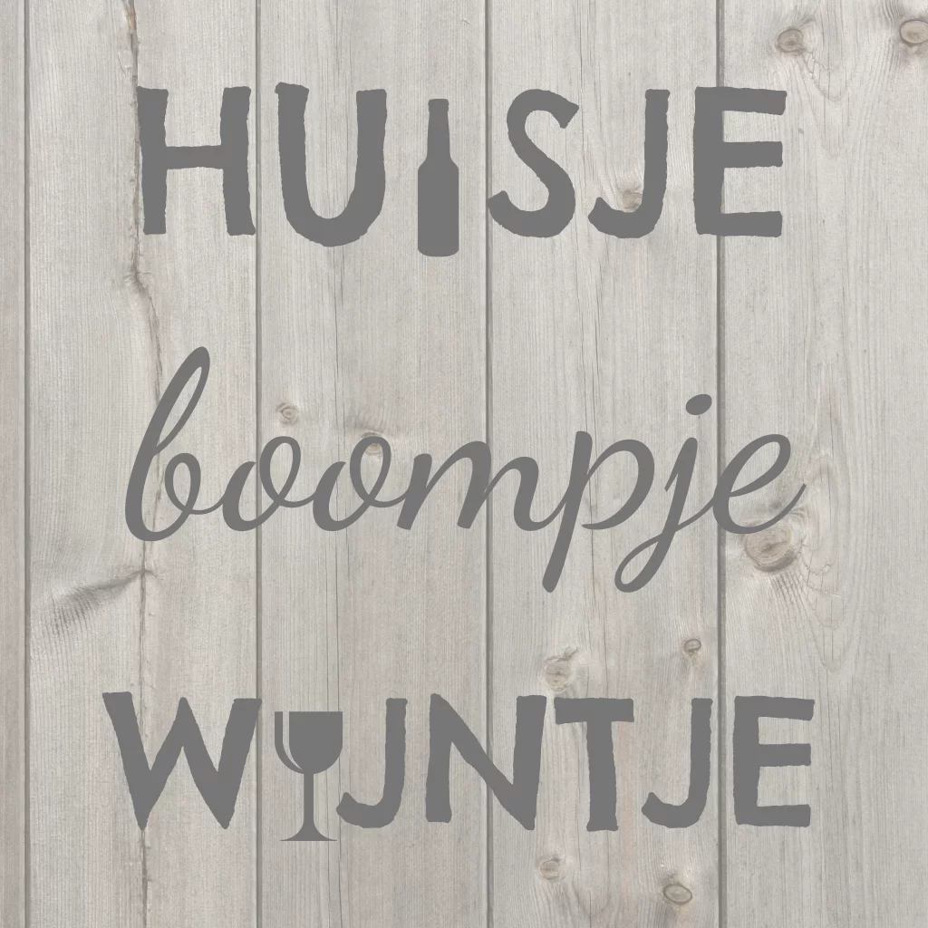 Verhuiskaart met de tekst huisje-boompje-wijntje op een achtergrond van grijze planken. (4306)