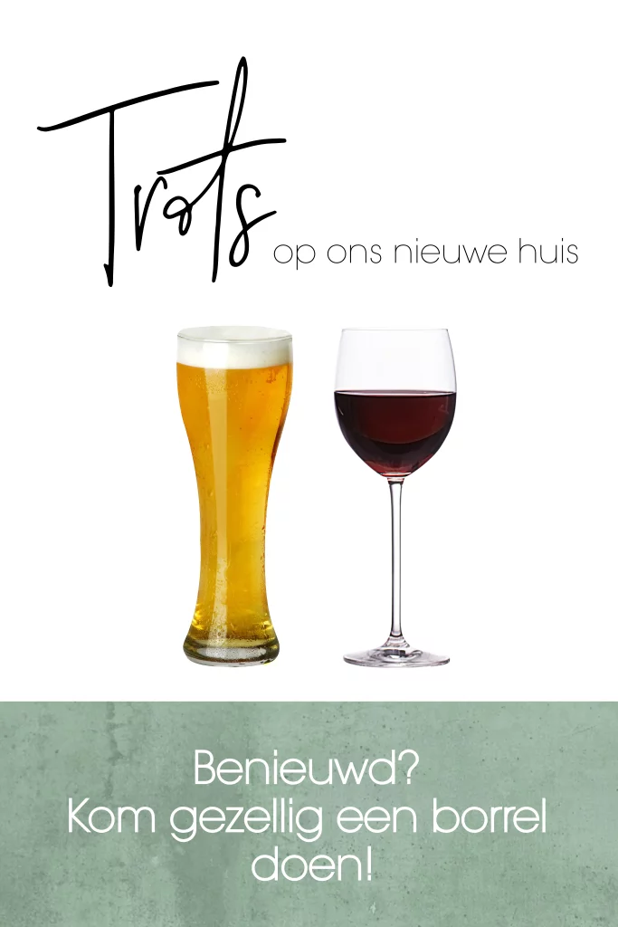 Verhuiskaart trots op onze nieuwe huis Kom lekker een borrel biertje wijntje doen!