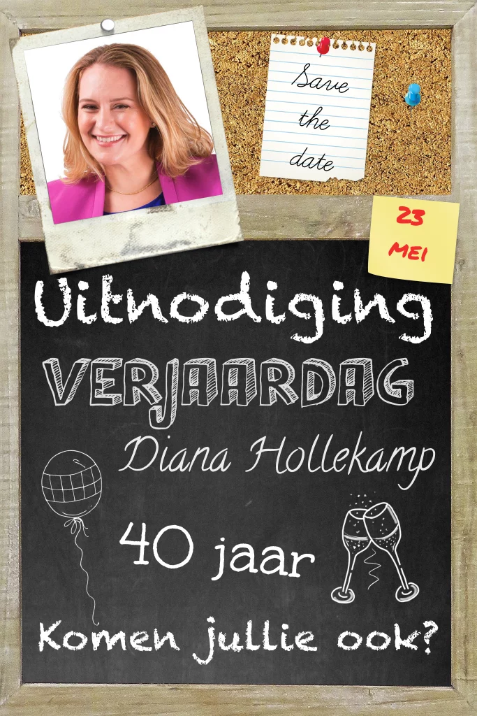 Hippe uitnodiging voor een 40e verjaardag met krijtbord en een prikbord. Teksten zijn eenvoudig aan te passen. (6648)