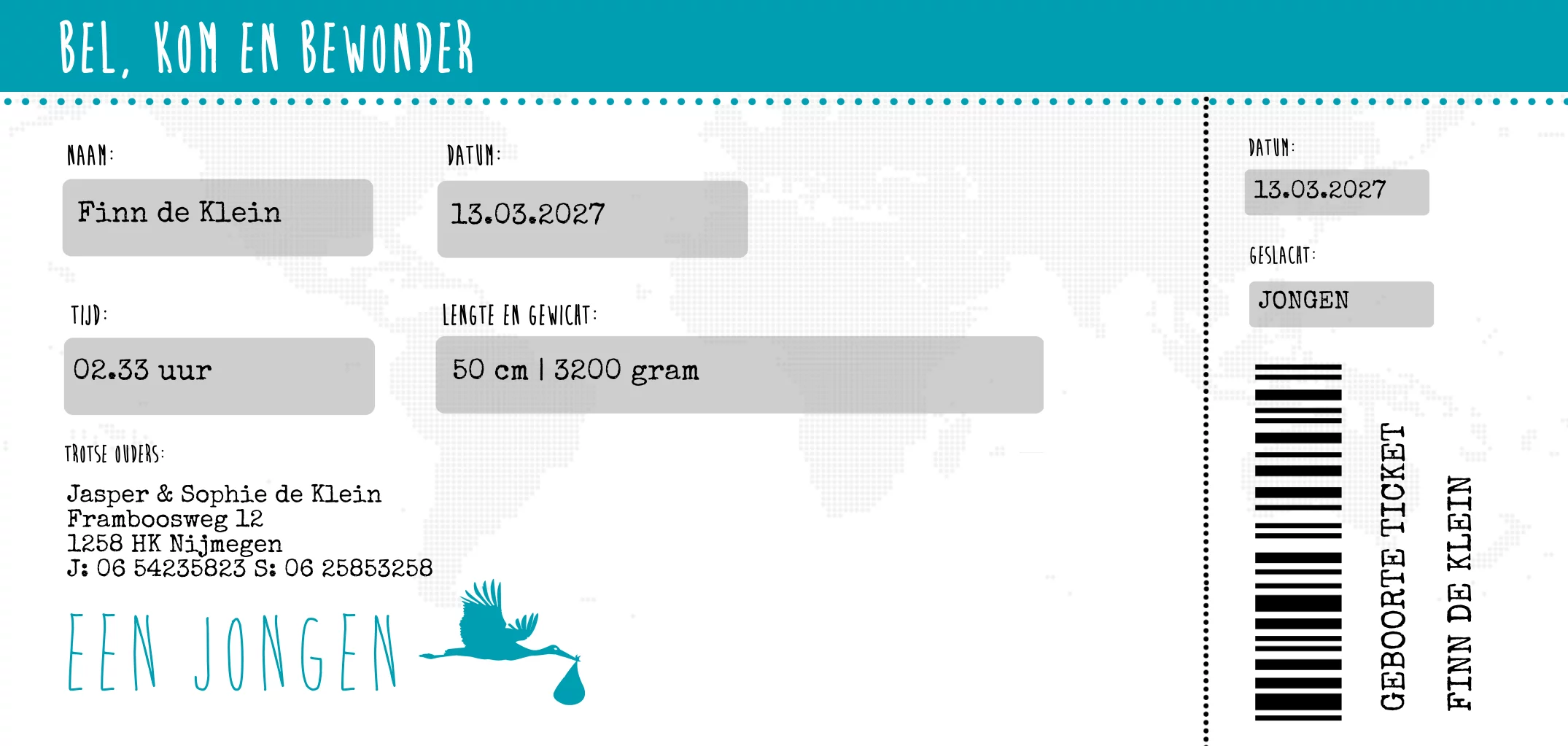 Hip langwerpig geboortekaartje voor een jongen in de vorm van een vliegticket met ooievaar. (4450)