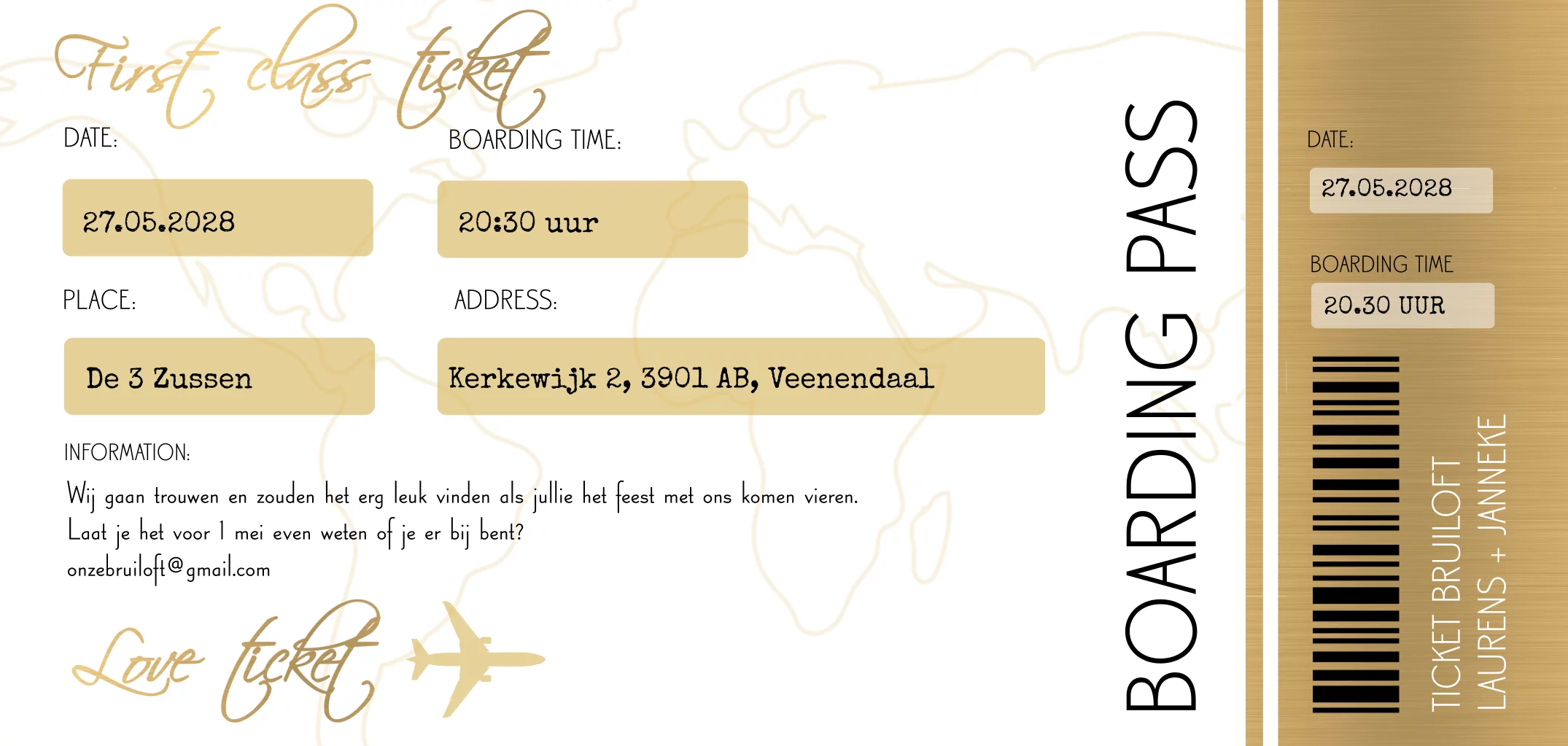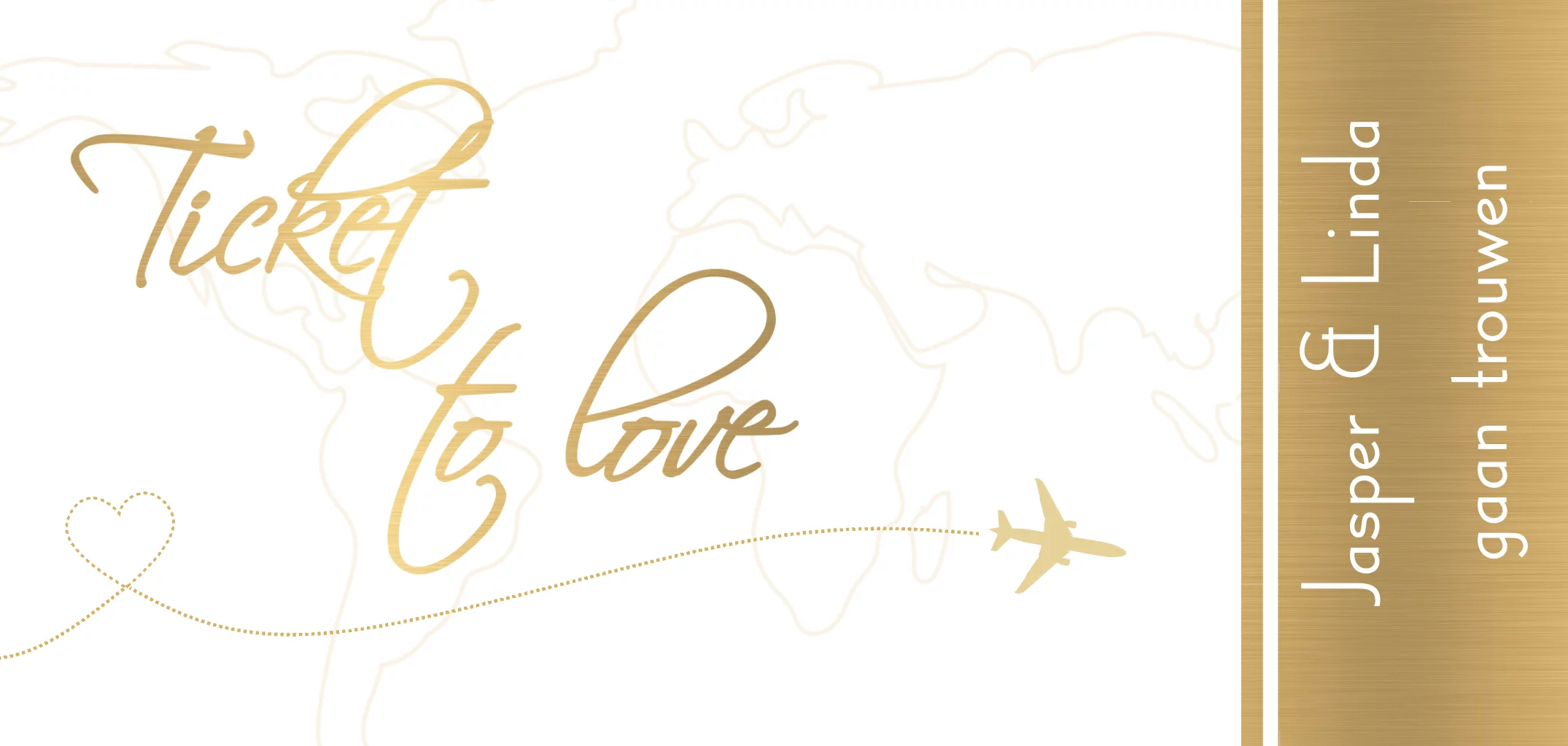 Langwerpige trouwkaart in de vorm van een vliegticket met goud-look ticket to love (7270)