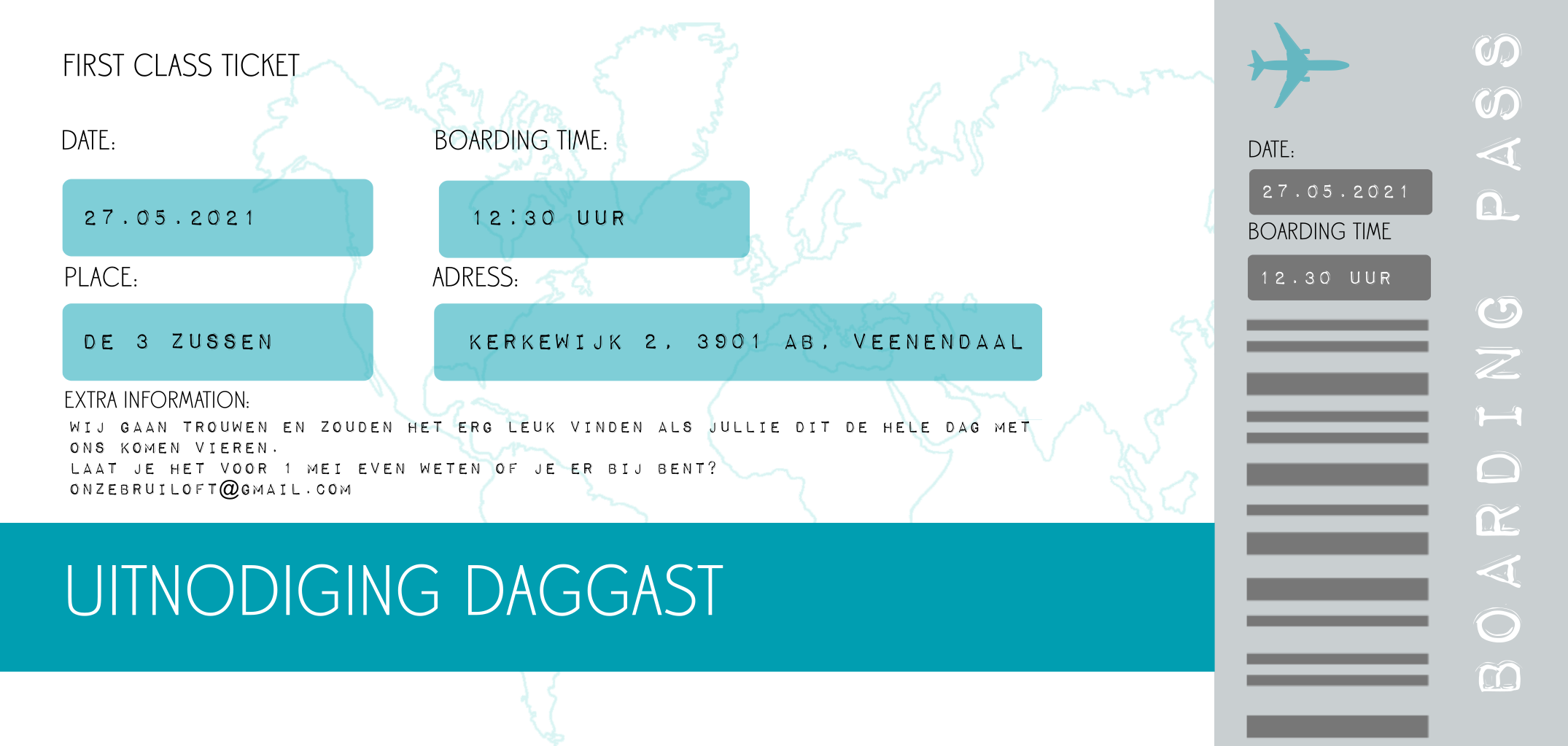 Vliegticket trouwkaart. Hip en modern in een langwerpig formaat. De kleur turquoise is zelf naar wens aan te passen (4443)