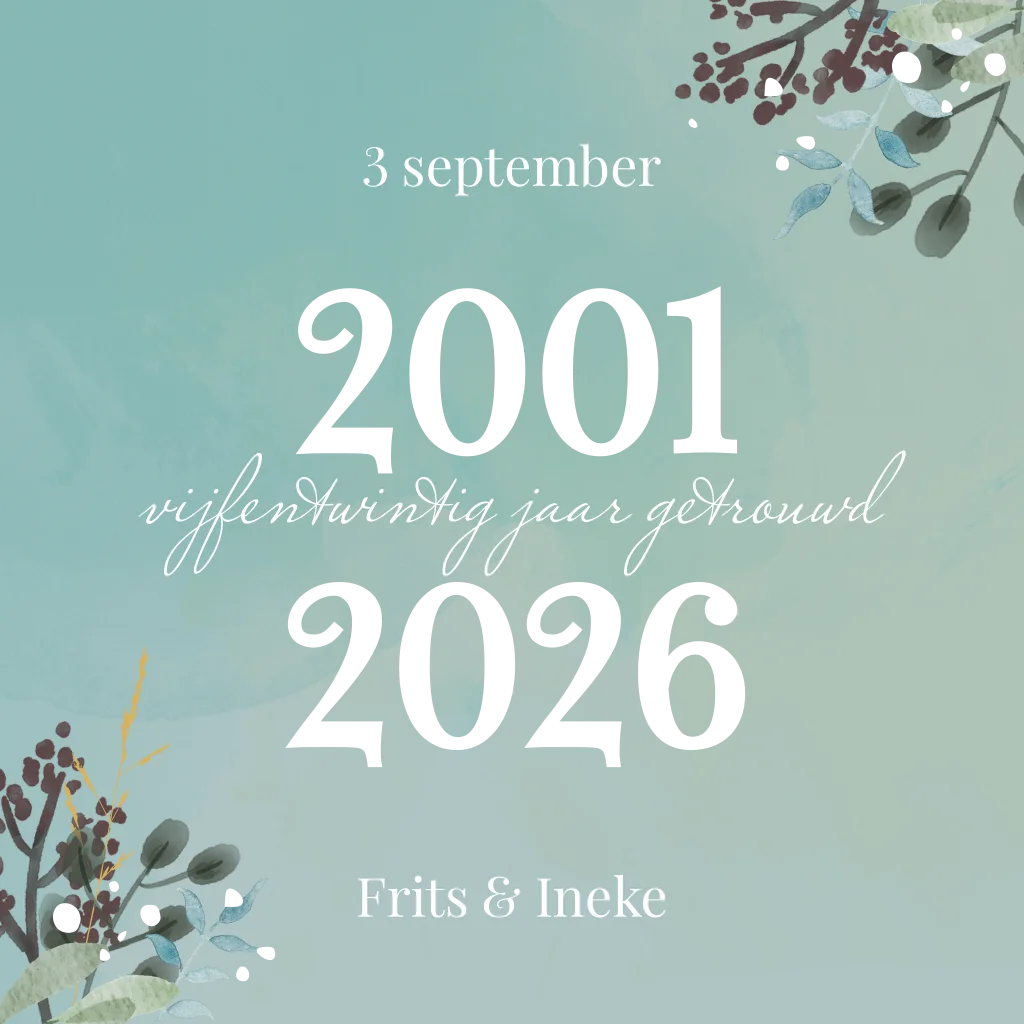 Vrolijke uitnodiging uitnodiging 25 jaar getrouwd 2001 met gouden jaren 2001 en 2026. De kleuren zijn naar wens aan te passen. (24255)