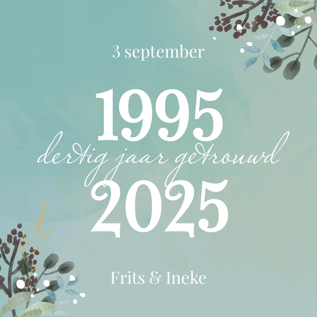 Vrolijke uitnodiging 30 jaar getrouwd 1994 met gouden jaren 1995 en 2025. De kleuren zijn naar wens aan te passen. (24255)