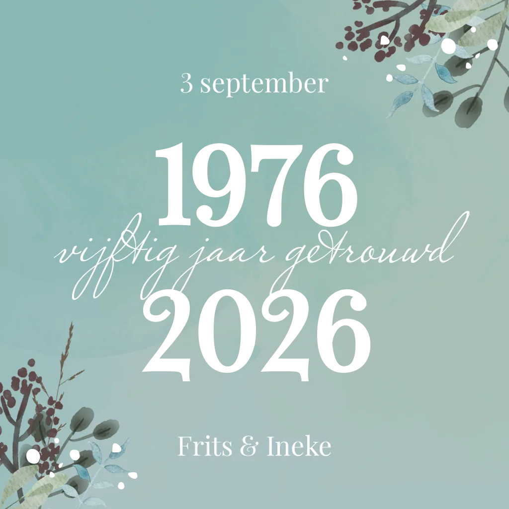 Vrolijke uitnodigingen 50 jaar getrouwd 1976 met gouden jaren 1976 en 2026. De kleuren zijn naar wens aan te passen. (24255)