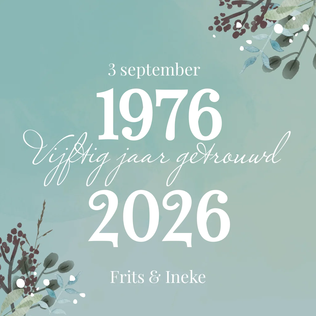 Vrolijke uitnodigingen 50 jaar getrouwd 1976 met gouden jaren 1976 en 2026. De kleuren zijn naar wens aan te passen en de kaart heeft glimmende goudfolie op de voorkant (24255)