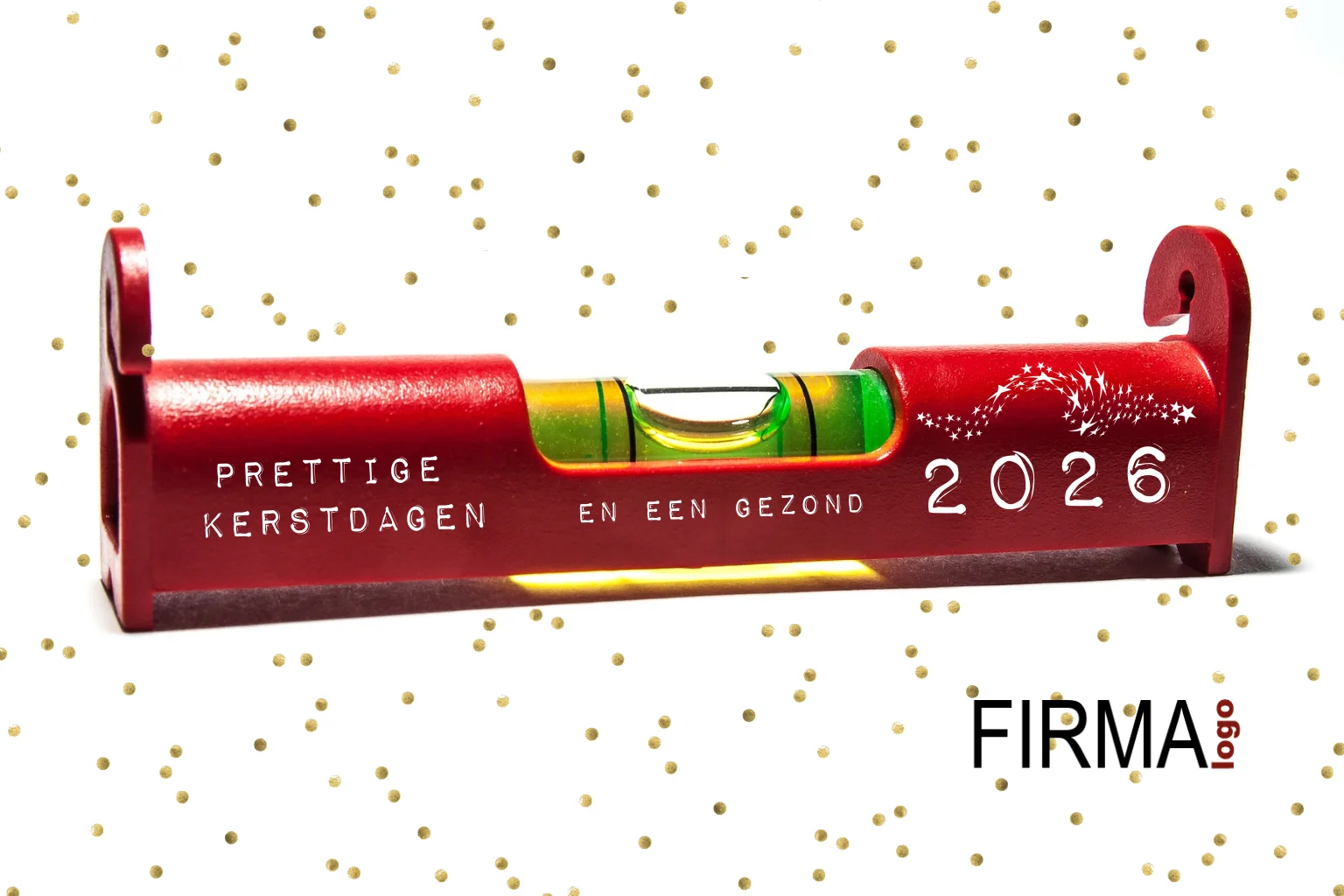 Zakelijke kerstkaart met bedrijfslogo en afbeelding van een rode waterpas. Voor bouwsector, aannemer en timmerman. (999999)