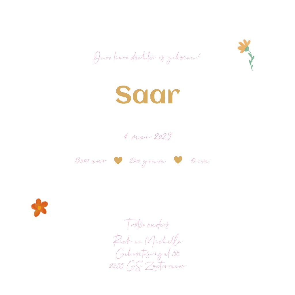Geboortekaartje voor een meisje met streepjes patroon, bloemen en een konijntje met een bloem op haar hoofd. De naam op de voorkant staat in goudfolie (30248)