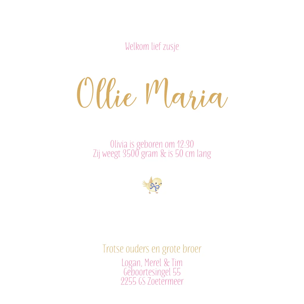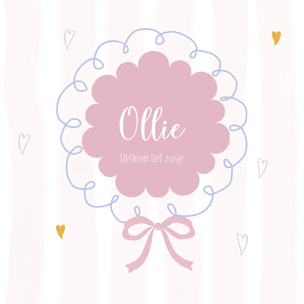 Vierkant geboortekaartje meisje met getekend roze strikje voor een baby meisje dochter. De streepjes achtergrond is optioneel en aan te passen in de editor, net zoals de foliekleur en illustraties aan de binnenkant. (30396)