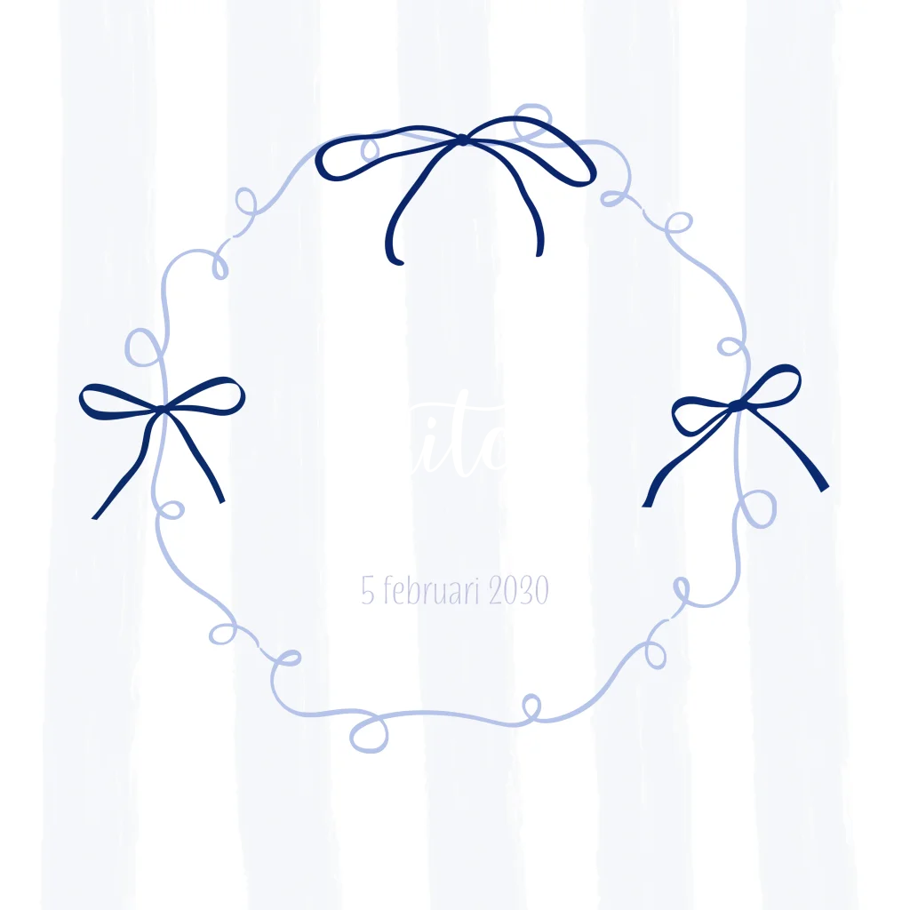 Vierkant geboortekaartje jongen met blauw getekende strikjes! De streepjes achtergrond is optioneel en aan te passen in de editor, net zoals de foliekleur en illustraties aan de binnenkant. (30396)