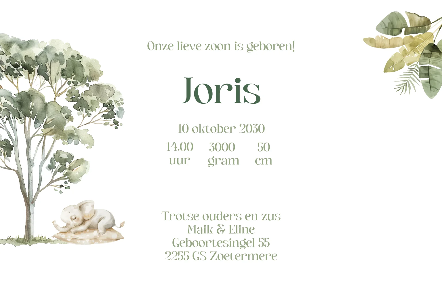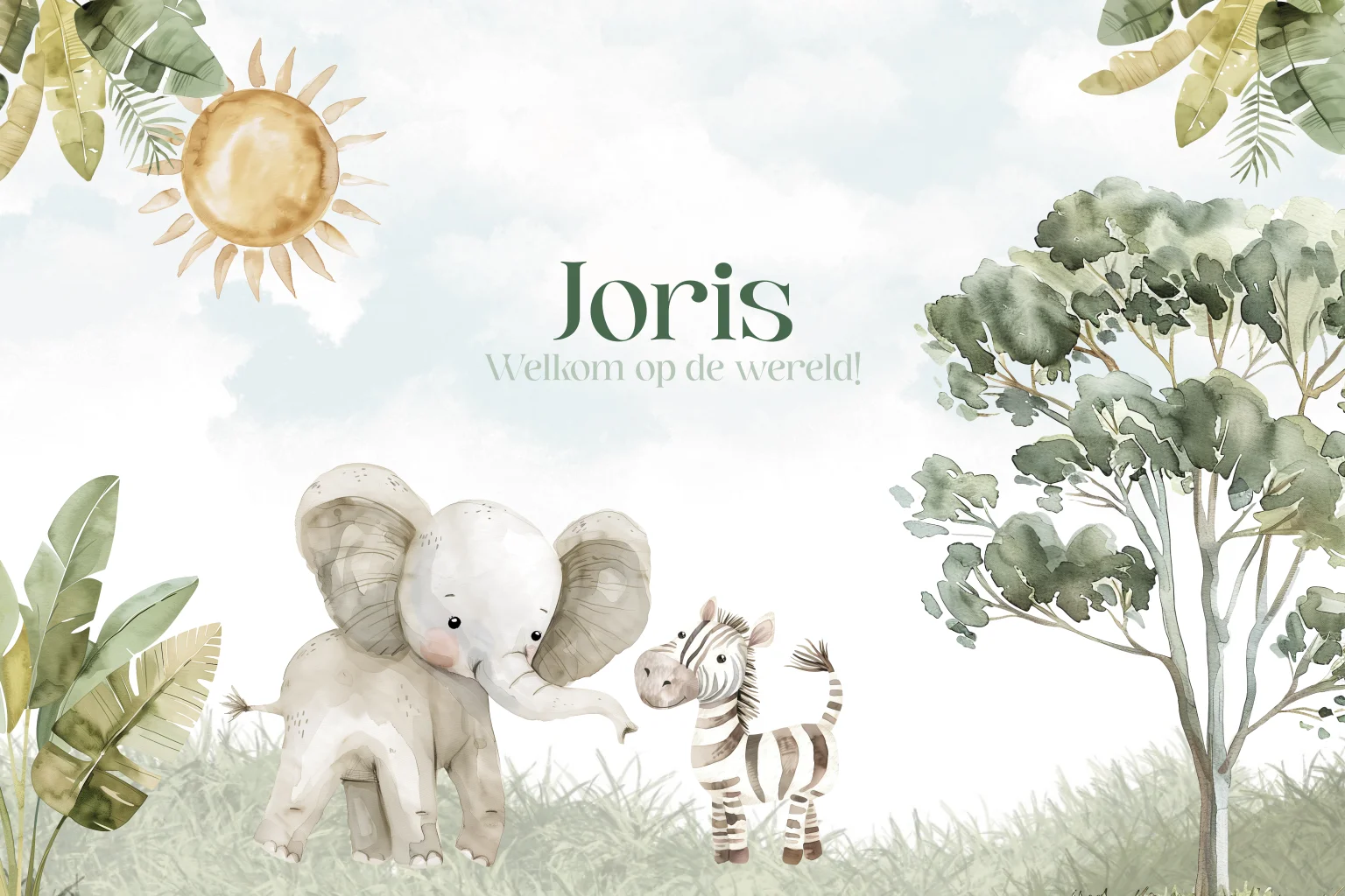 Geboortekaartje voor een jongetje met een olifant en zebra, zon en jungle bomen in safari / jungle thema. (30262)