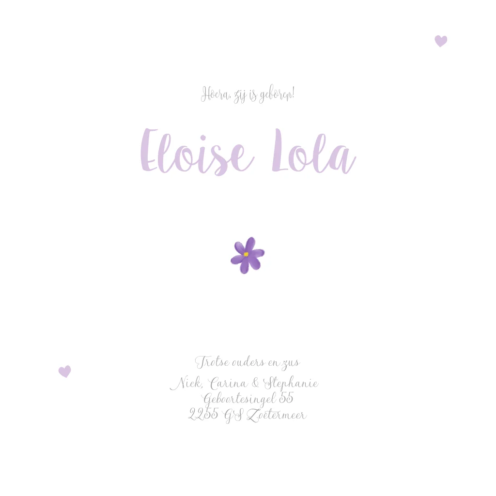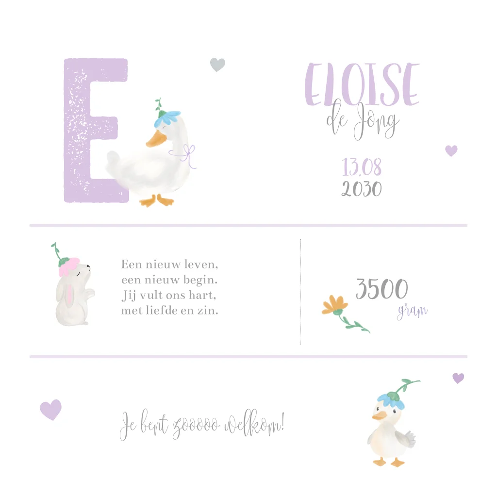 Geboortekaartje meisje met tekstvakken bloemetjes en dieren zoals een een eendje en een konijntje. (30252)