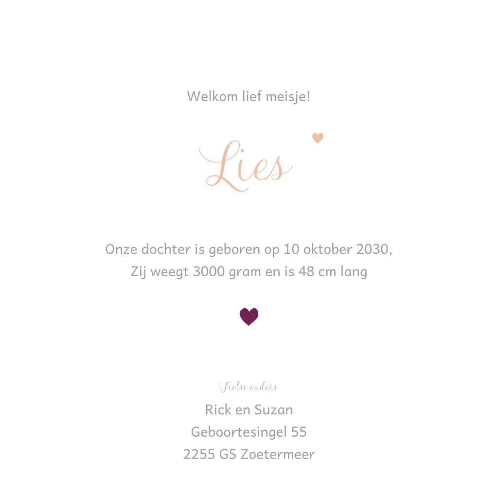 Een geboortekaartje voor een meisje met lieve kangoeroes! Door de velvet look achtergrond in roze paars kleuren krijgt de kaart een andere uitstraling. Op de voorkant hartjes en de naam in foliedruk rosegoud (30257)