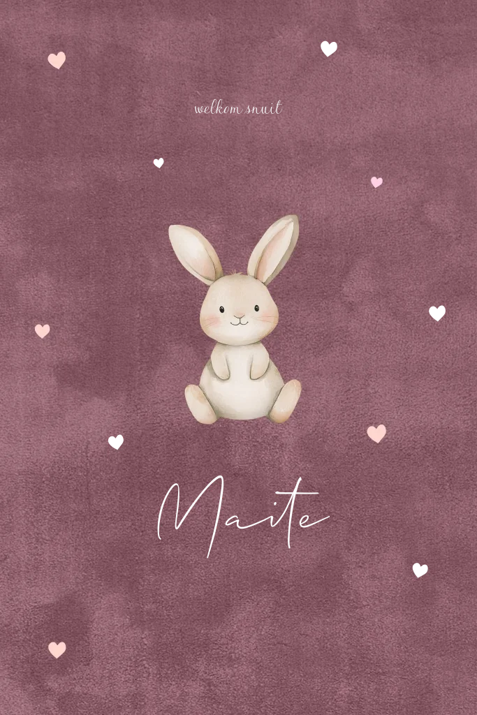 Een meisjes geboortekaartje met een konijntje en hartjes met een velvet-look achtergrond warm paars roze. (30259)