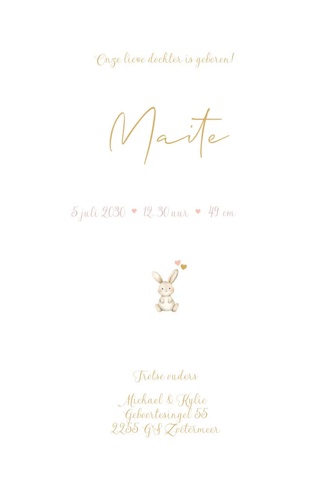 Geboortekaartje meisje met konijntje, hartjes en velvet achtergrond