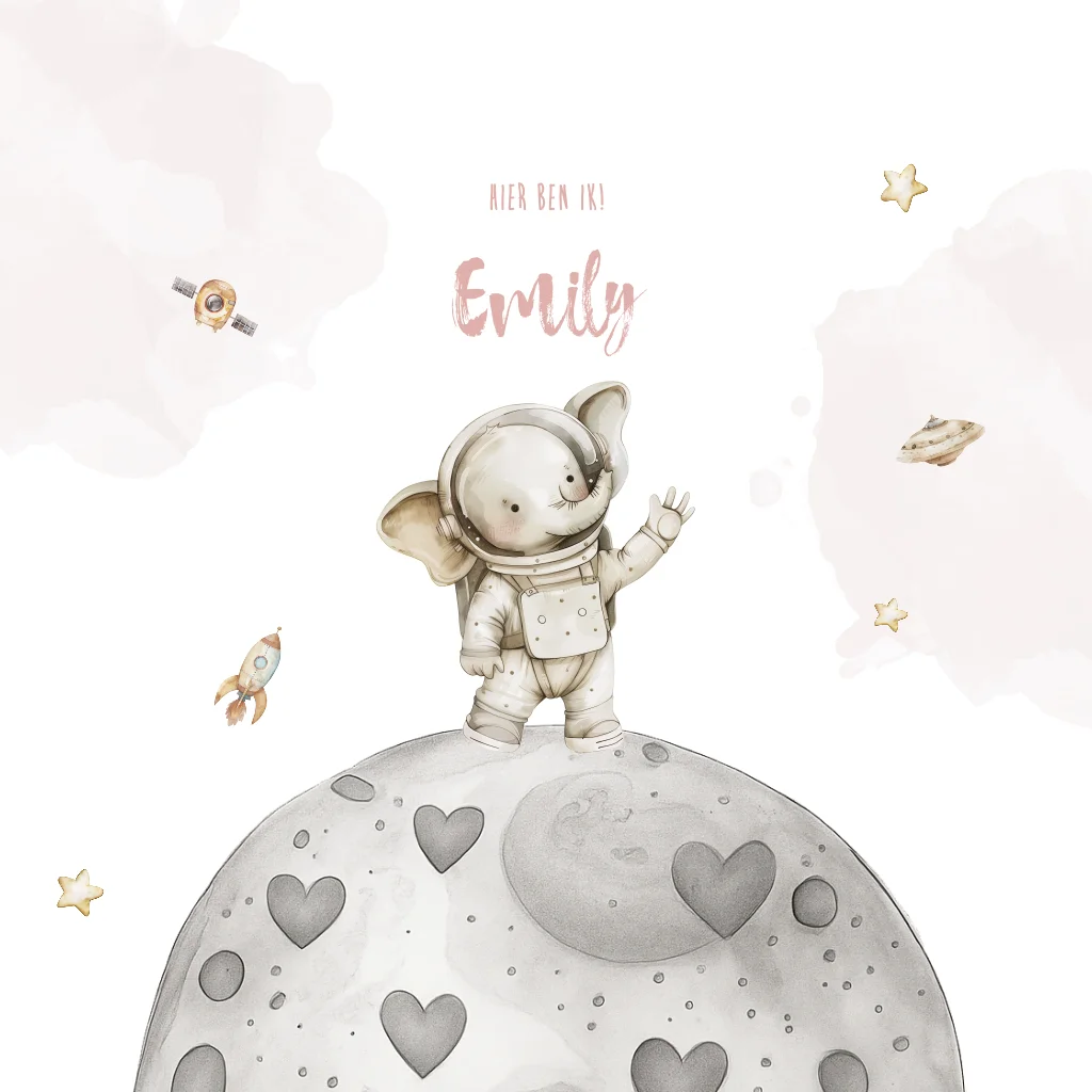 Geboortekaartje voor een meisje met een olifant in een ruimtepak op de maan. Met sterren, planeten, raket en hartjes. (30218) Deze kaart heeft ronde hoeken, maar kan ook met rechte hoeken ( - 0,30 per kaartje)