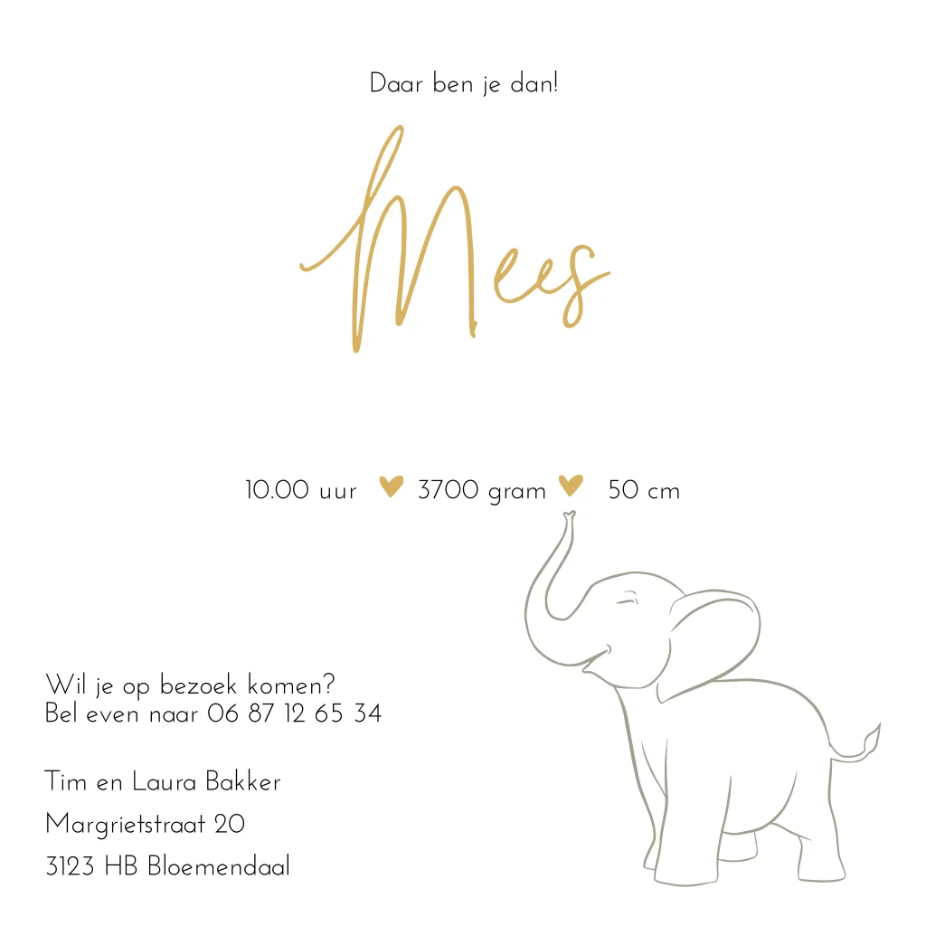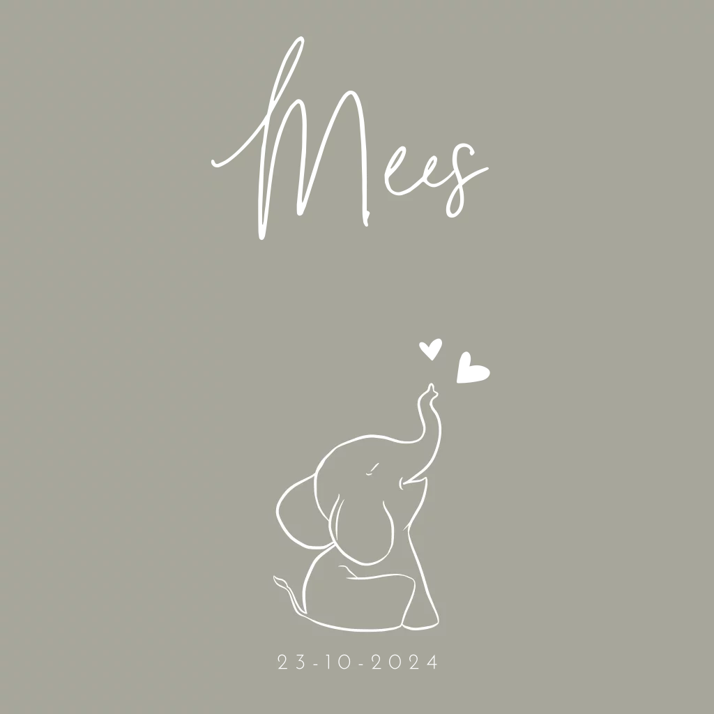 Lief en leuk geboortekaartje voor de geboorte van een jongen. De achtergrond kleur is grijsgroen en er staat een baby olifantje. De naam en enkele hartjes in goudfolie maken het geboortekaartje helemaal af. (22924)