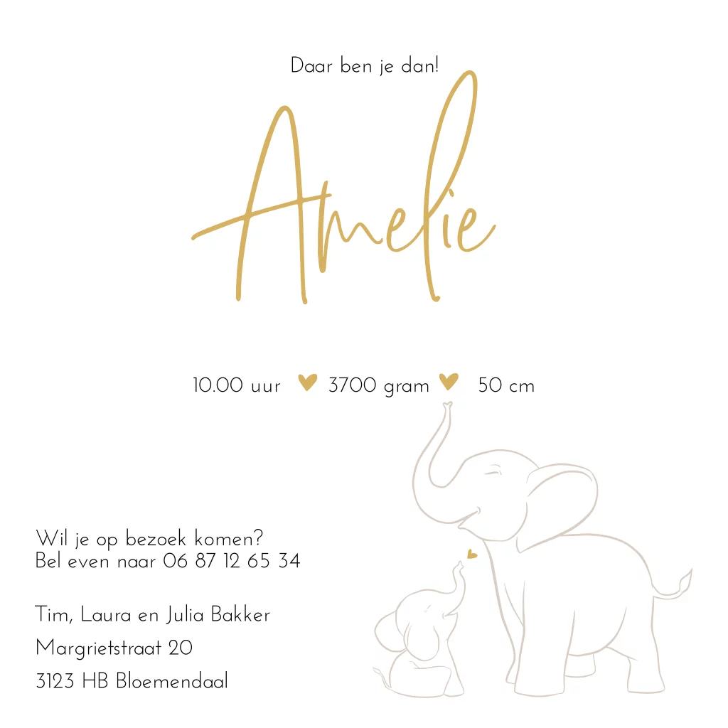 Lief geboortekaartje voor een lief zusje met 2 olifantjes met de naam en hartjes bij de slurf in goudfolie gedrukt. Je kunt ook een olifantje weghalen of bijplaatsen voor een broer of zus extra (22923)