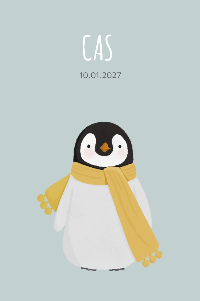 Winters geboortekaartje met getekende pinguïn met een shawl om zijn nek voor een jongen. (21658)