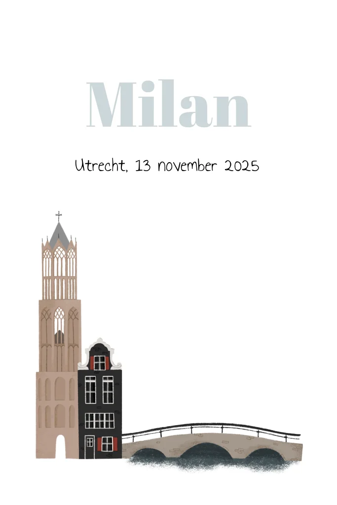Sfeervol geboortekaartje voor een jongen met gebouwen uit Utrecht