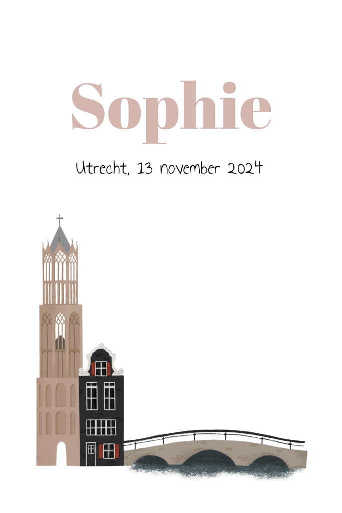 Sfeervol geboortekaartje Utrecht voor een meisje met gebouwen