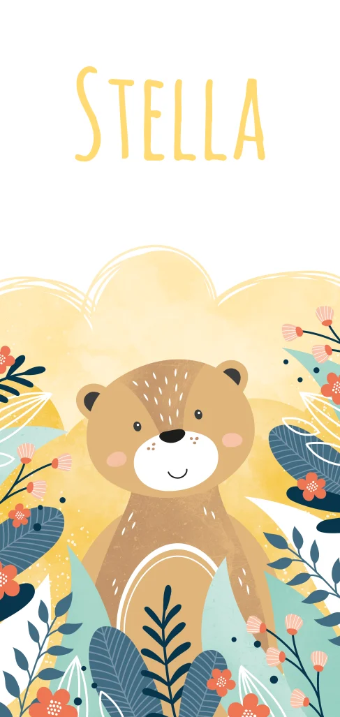 Geel geboortekaartje voor een meisje met beer en jungle bladeren