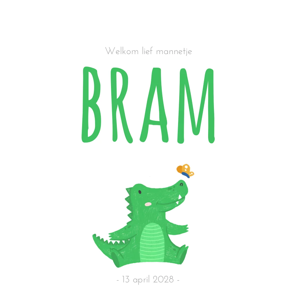 Leuk geboortekaartje in groene tinten voor een jongen. Met een getekende krokodil en vlindertjes. Alle elementen op de kaart zijn los en naar wens aan te passen. (21271)