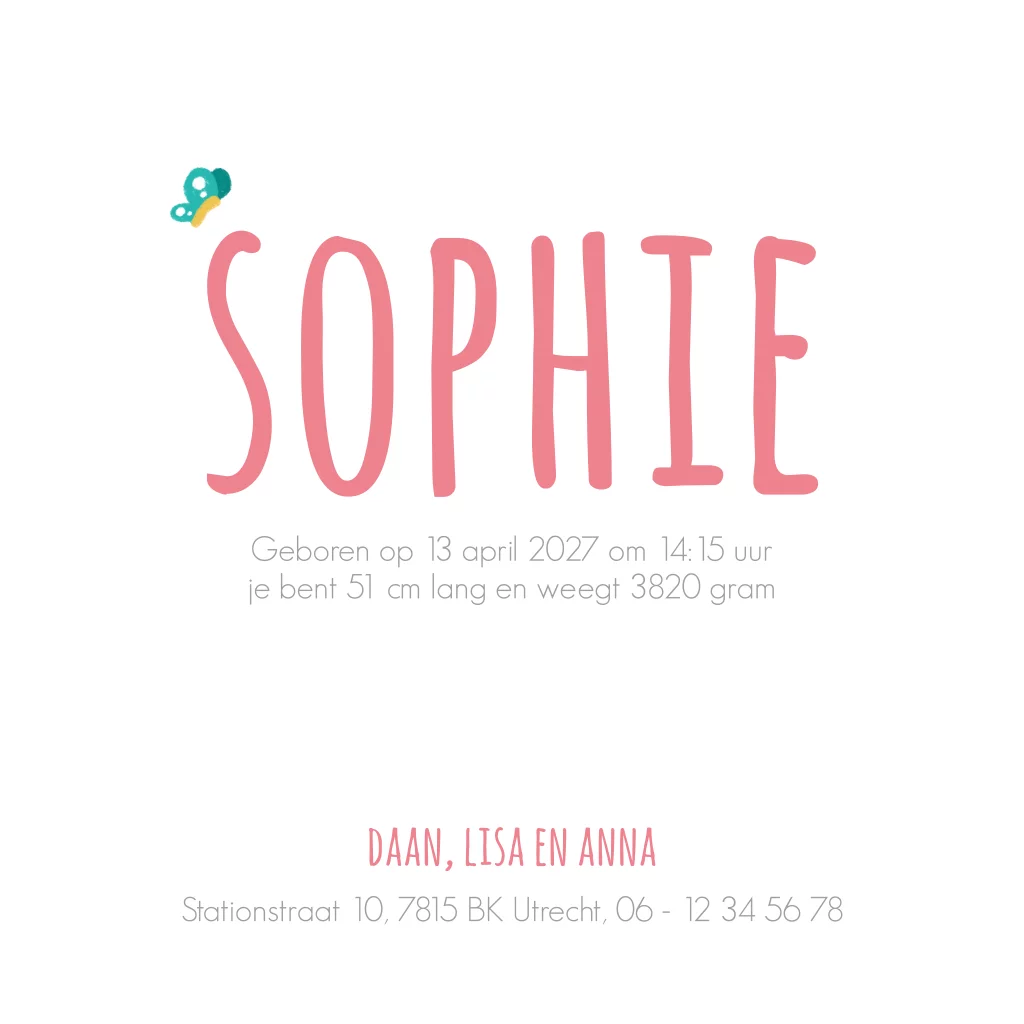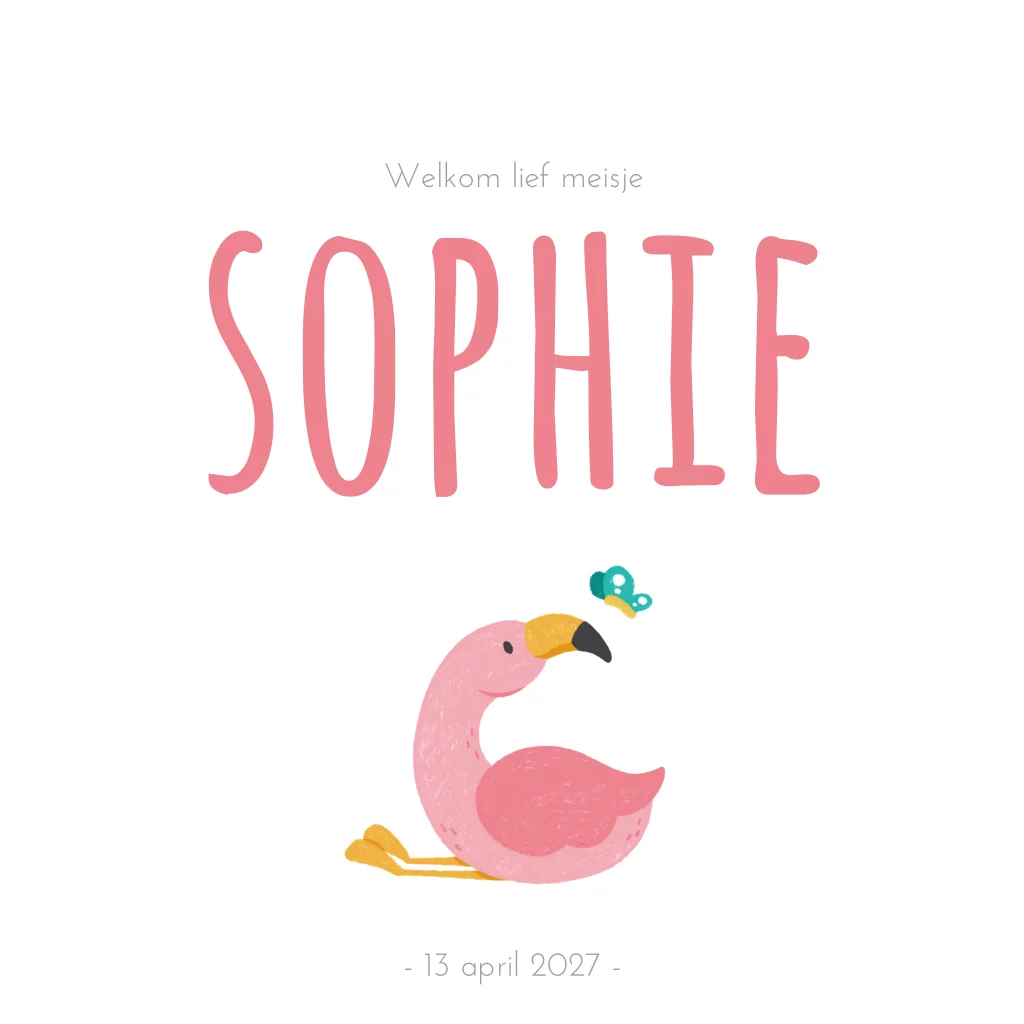 Lief geboortekaartje in roze tinten voor een meisje. Met een getekende flamingo en vlindertjes. Alle elementen op de kaart zijn los en naar wens aan te passen. (21272)