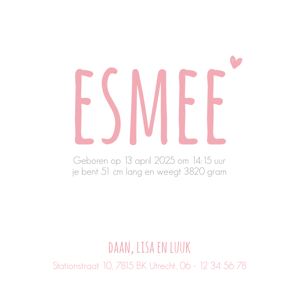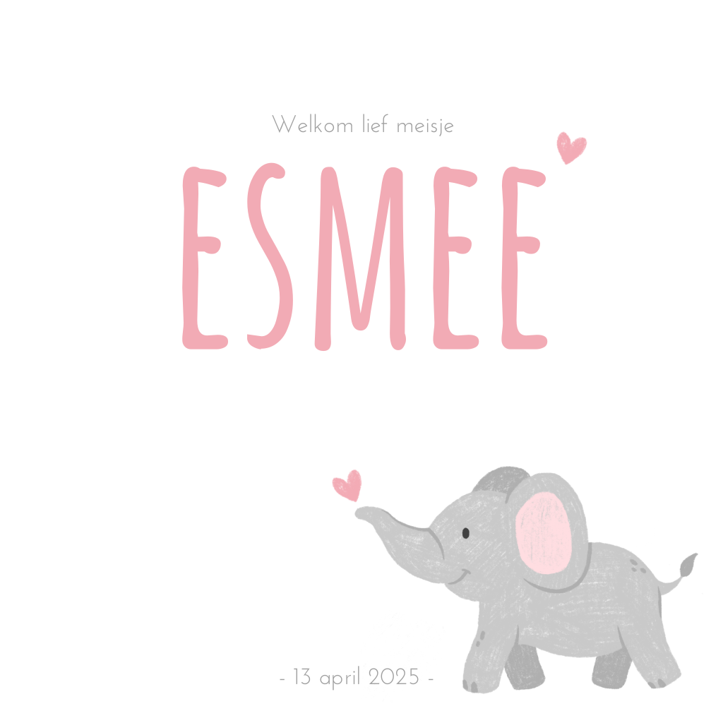 Lief geboortekaartje in zachte kleuren voor een meisje. Met een getekend olifantje en hartjes. Alle elementen op de kaart zijn los en naar wens aan te passen. (21273)