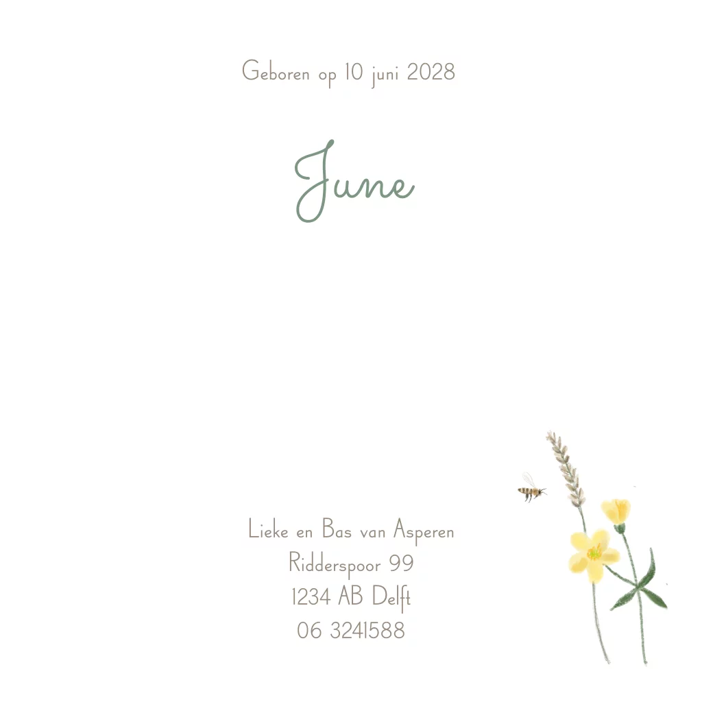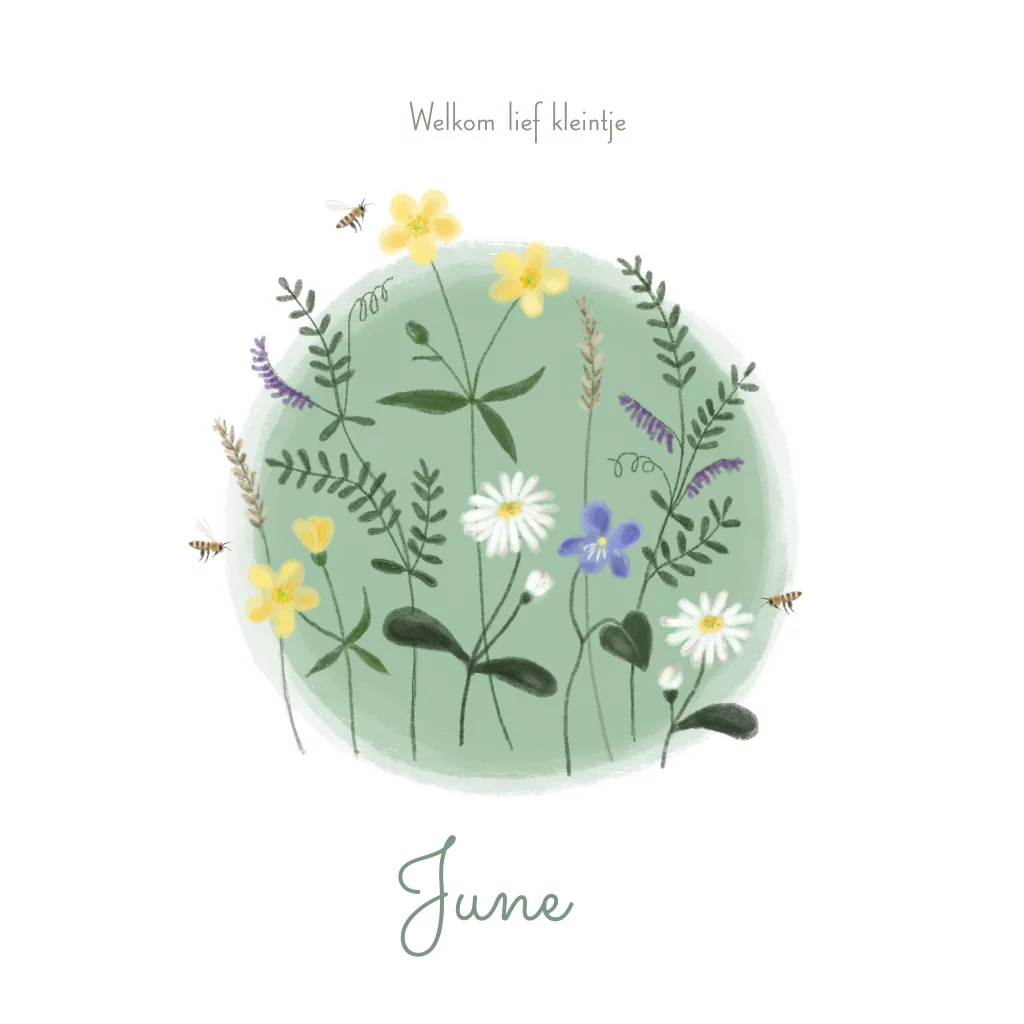 Een mooi zomers geboortekaartje voor een meisje met mooi geschilderde veldbloemen en bijen in wit, geel en lila. (23782)