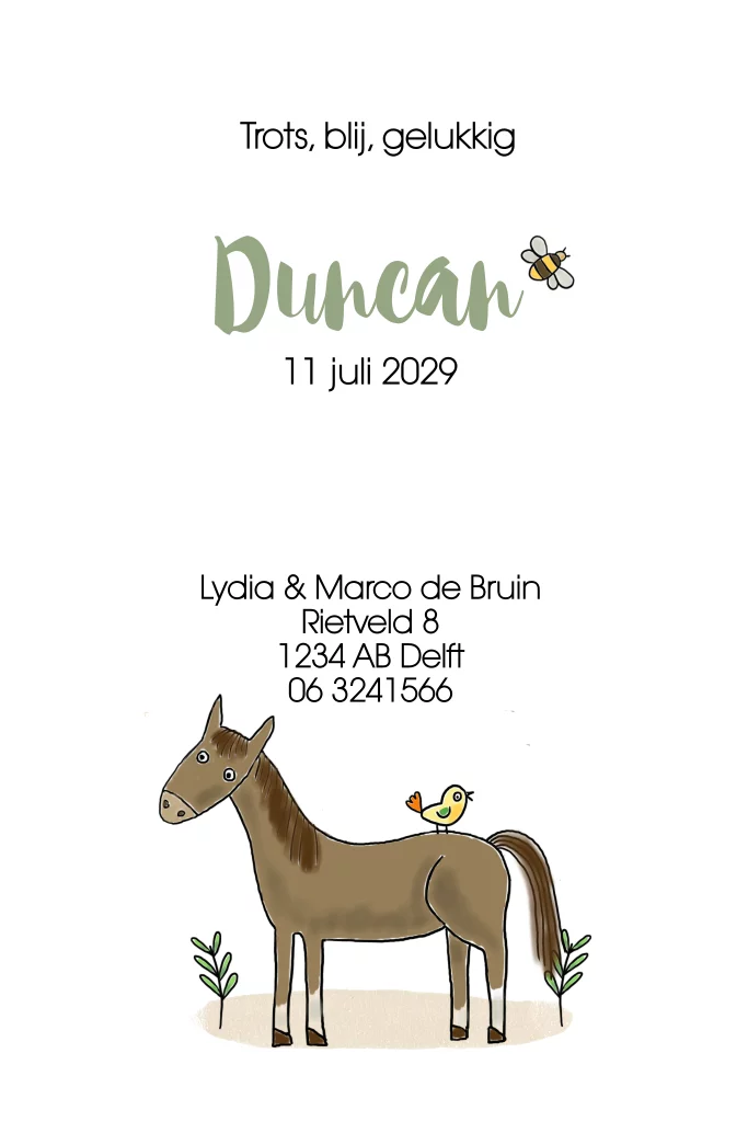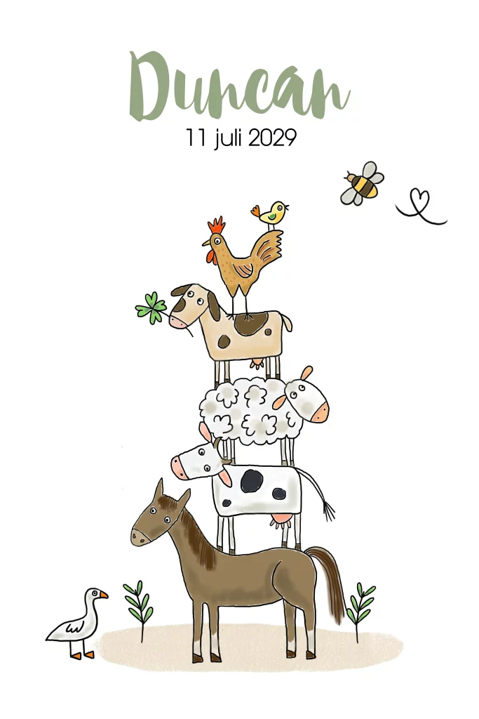 Een hip en vrolijk geboortekaartje voor een jongen met een stapel boerderij dieren. (8739)