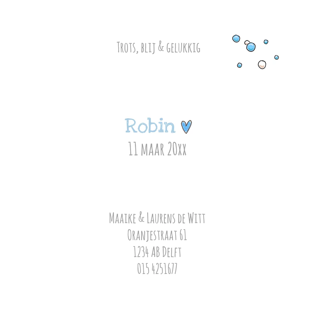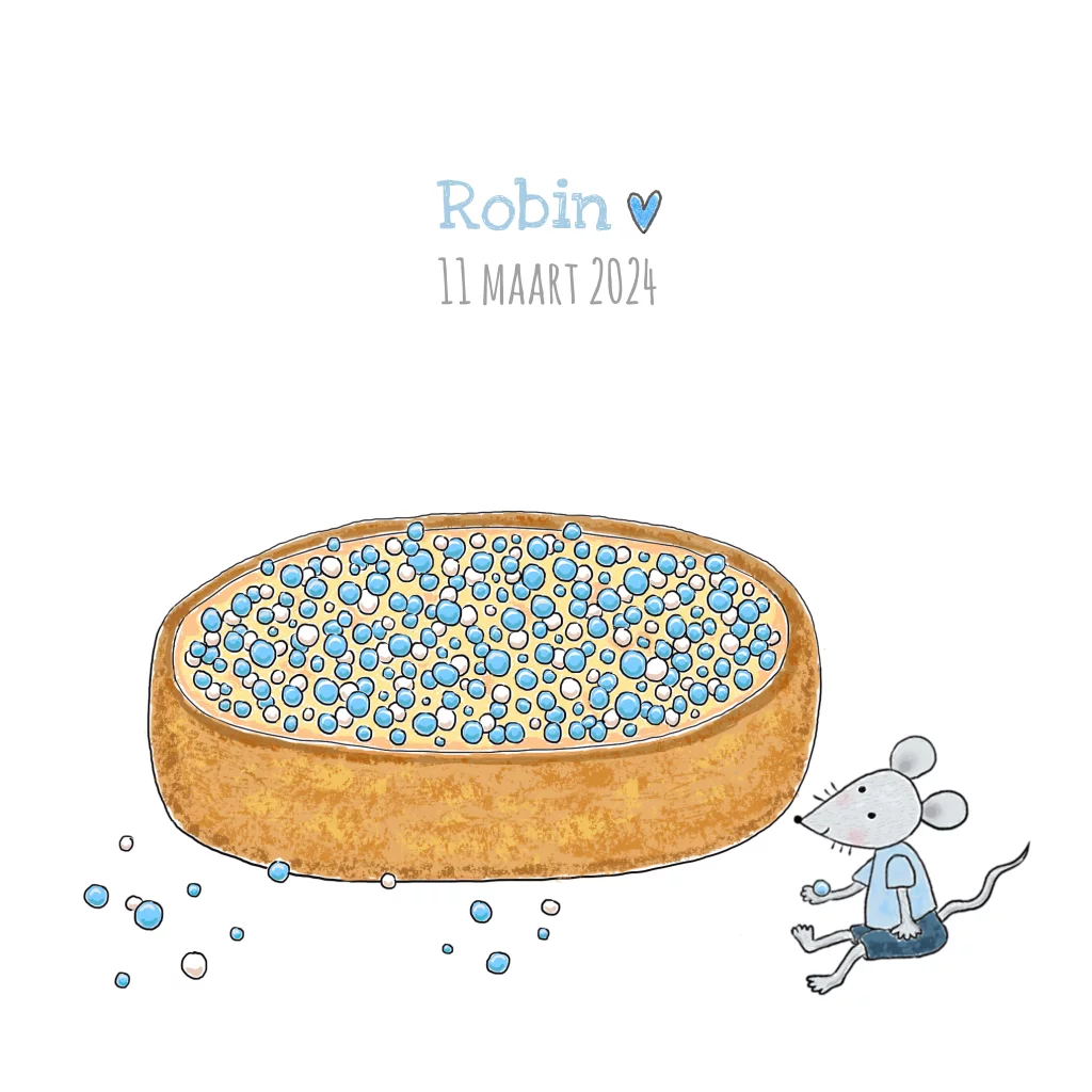 Een lief, getekend geboortekaartje voor een jongen met naast de beschuit met muisjes een ondeugende 'echte' muis. (6762)