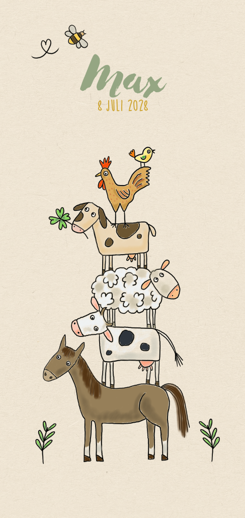 Een hip geboortekaartje voor een jongen met een stapel boerderij dieren op kraft. Met veel grappige details. (8738)
