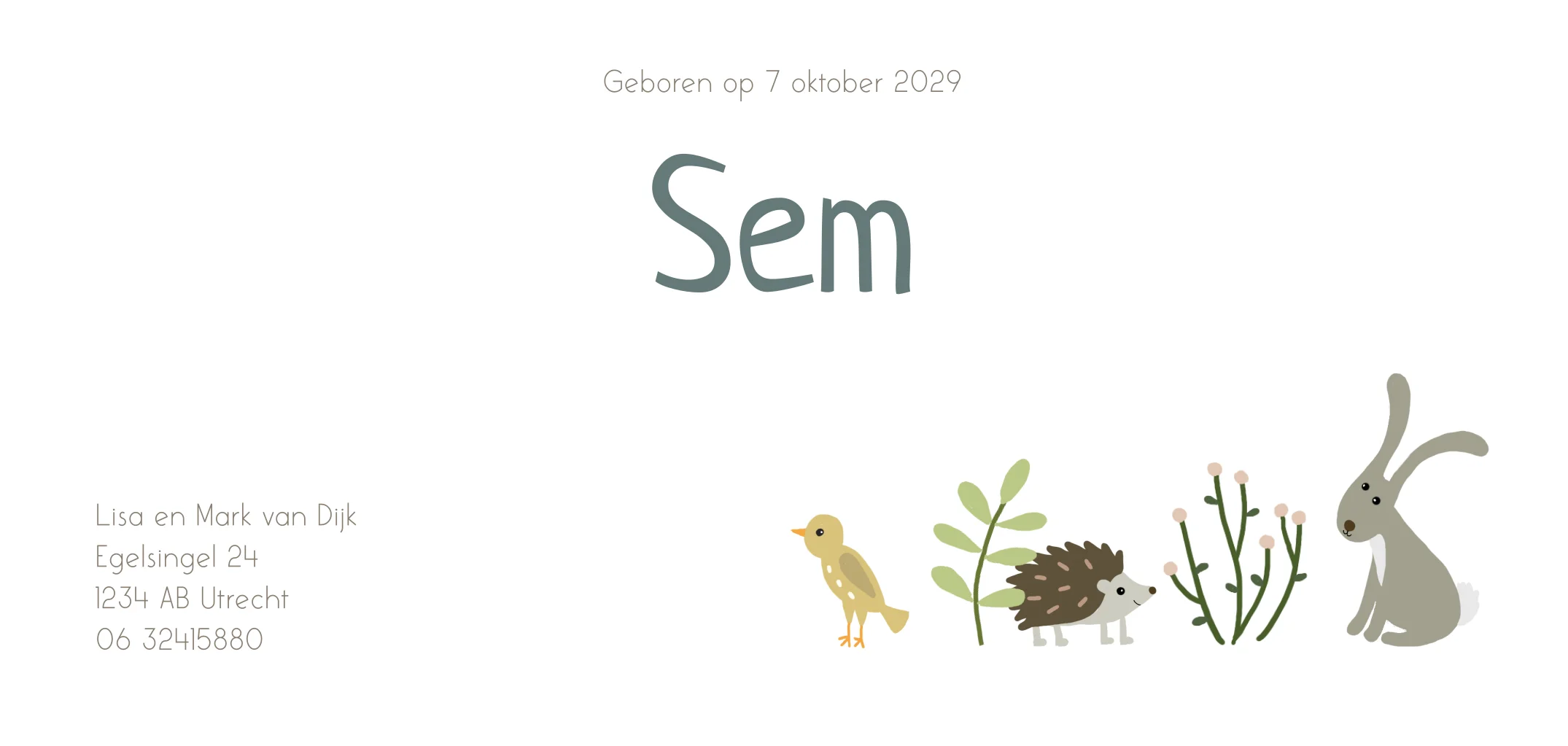 Vrolijk herfst thema geboortekaartje voor een jongen met bosdieren op een rij getekend (24728)