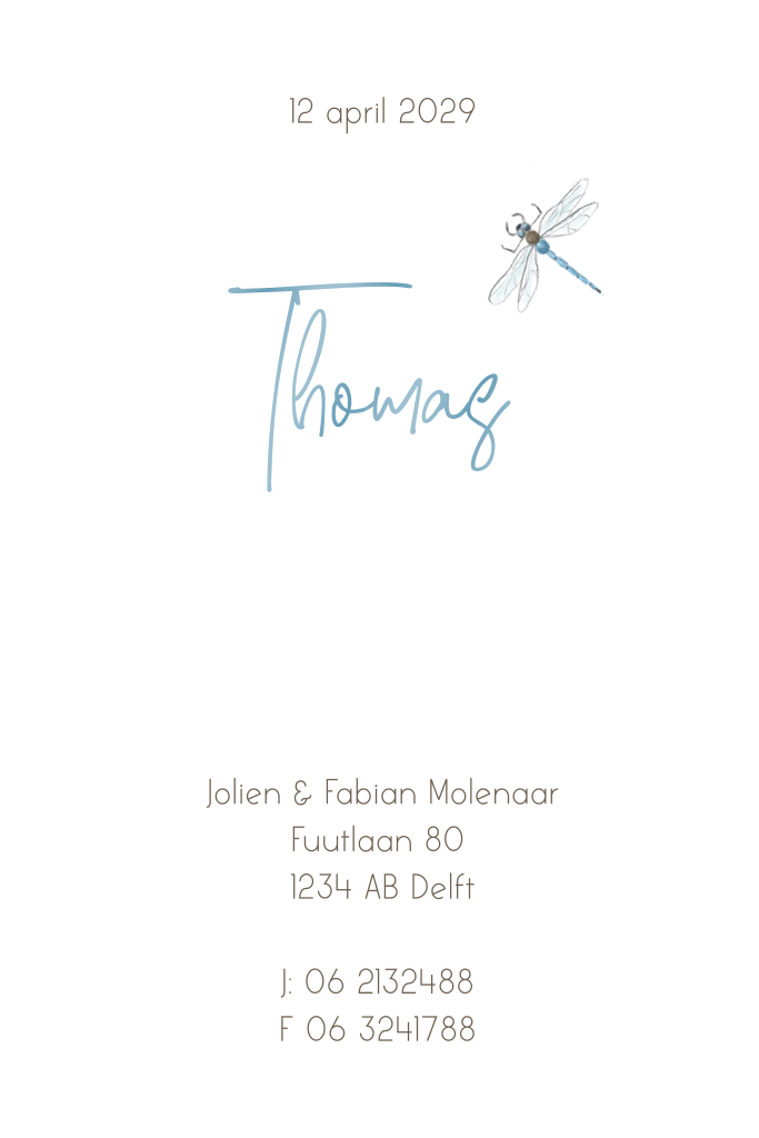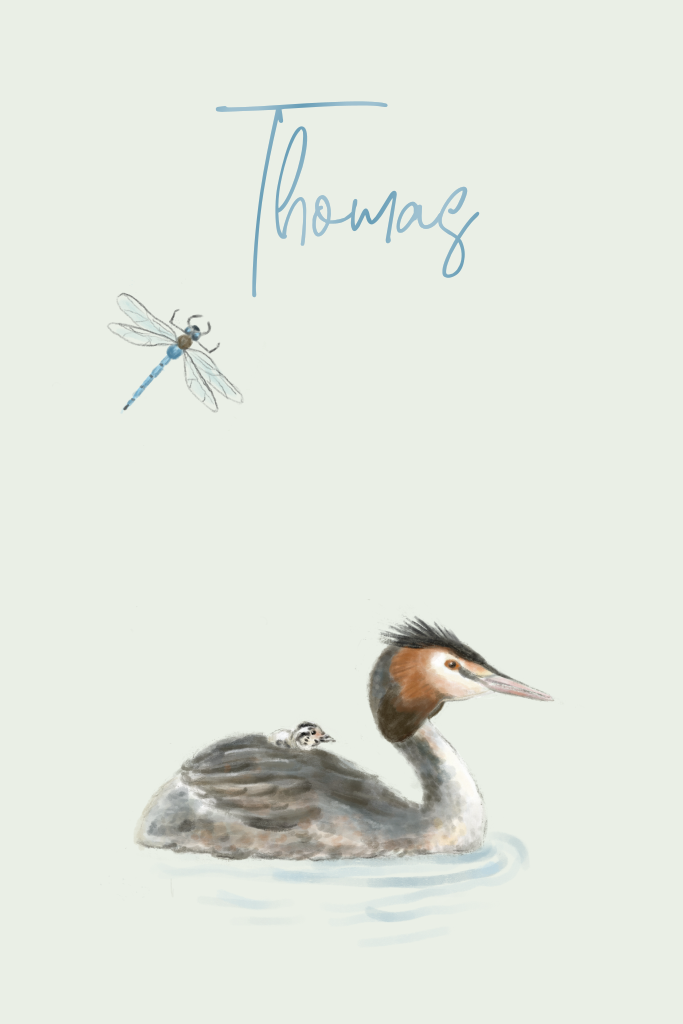 Een origineel en mooi geschilderd geboortekaartje voor een jongen. Een mooi lente- en zomer geboortekaartje met een fuut met kleintje en een libelle. (24032)