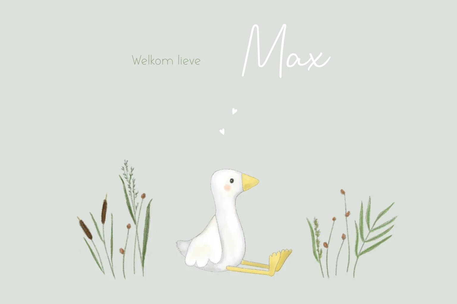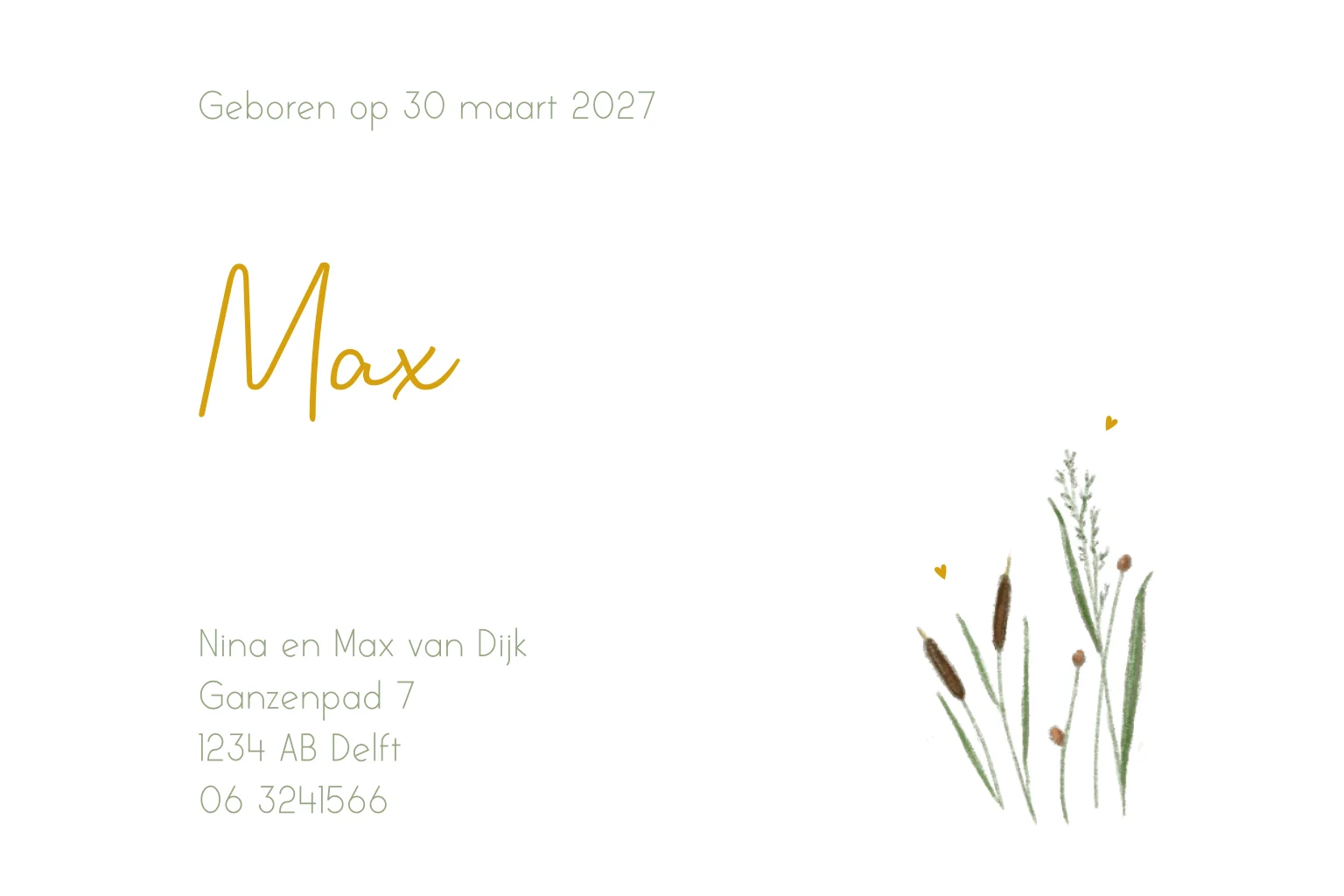 Een hip geboortekaartje voor een jongen met een schattig gansje en riet ernaast. Naam in goudfolie foliedruk. (23113) Waterdieren eendje