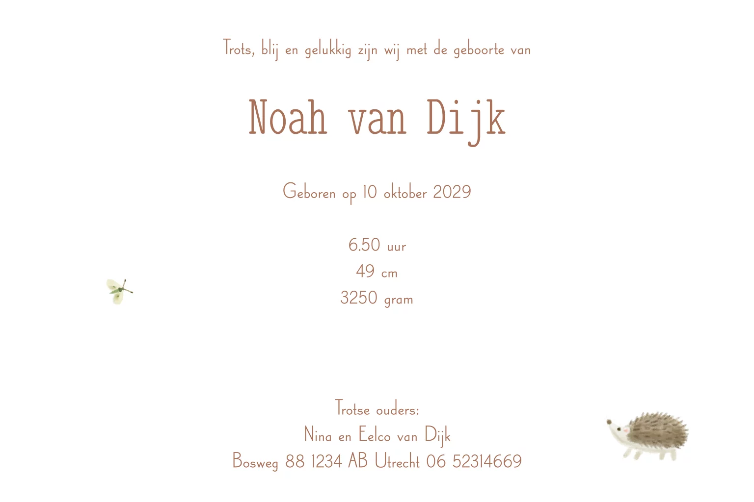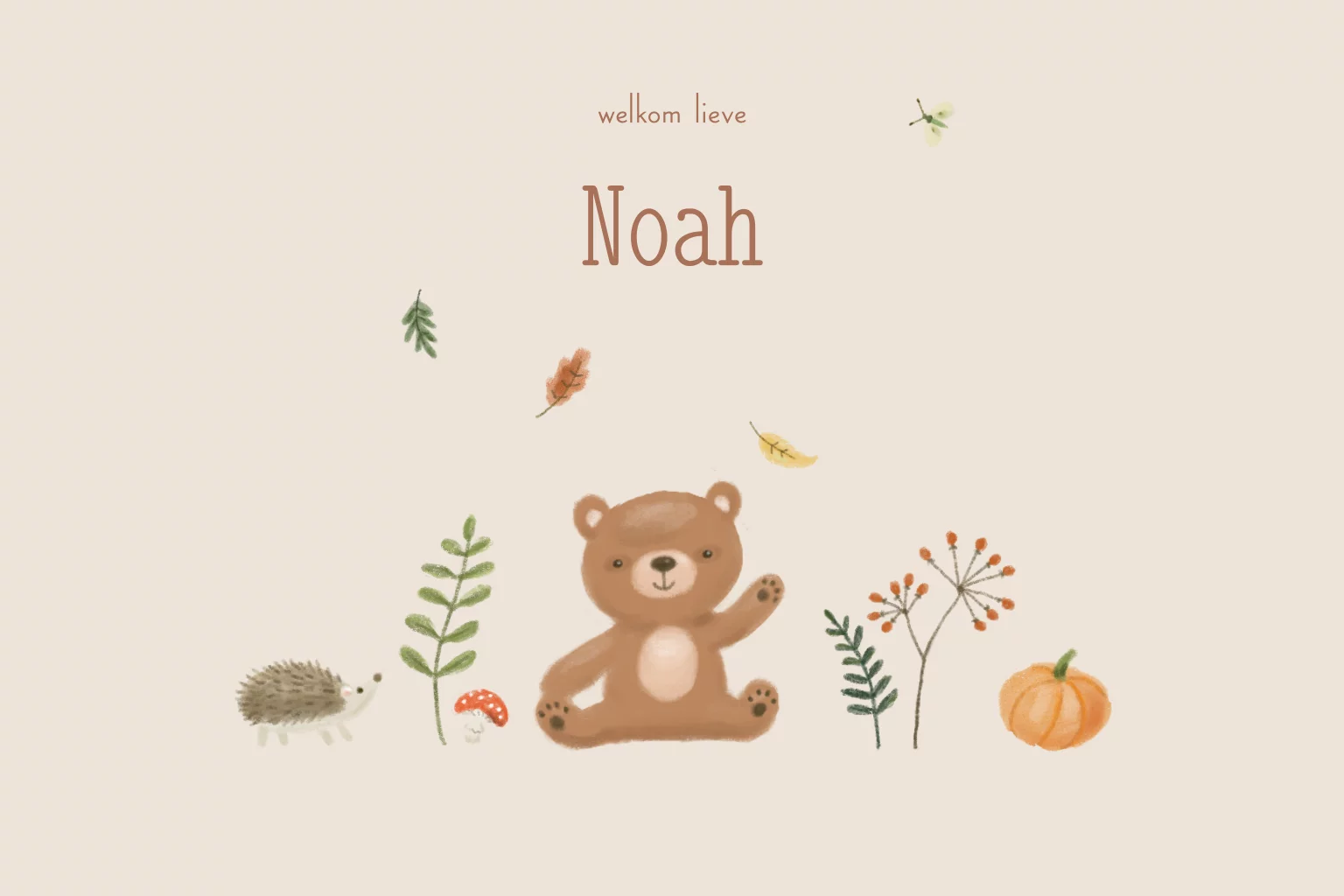 Een sfeervol neutraal herfst geboortekaartje voor een jongen of meisje met beer egel , paddestoel, pompoen en herfstbladeren. (24046)