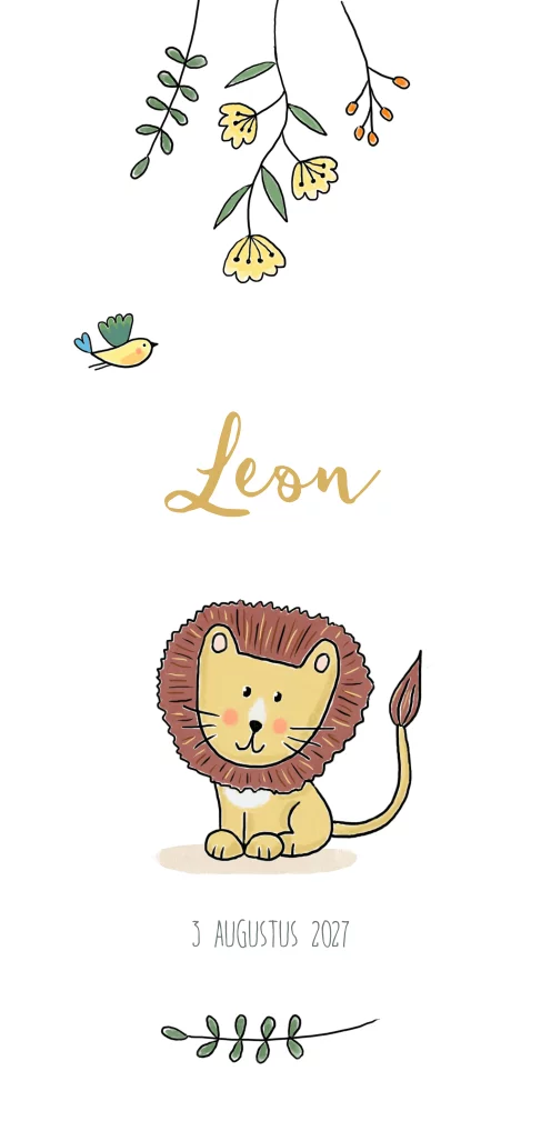 Een hip, getekend geboortekaartje voor een jongen met een leeuwtje, planten en vogel. Dit geboortekaartje kan helemaal naar wens worden aangepast. (7722)