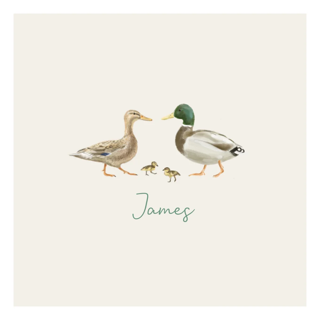 Een geboortekaartje voor een 2de kindje met een eendenfamilie? Papa en mama eendje en 2 kuikens. (24447) Geboortekaartje James