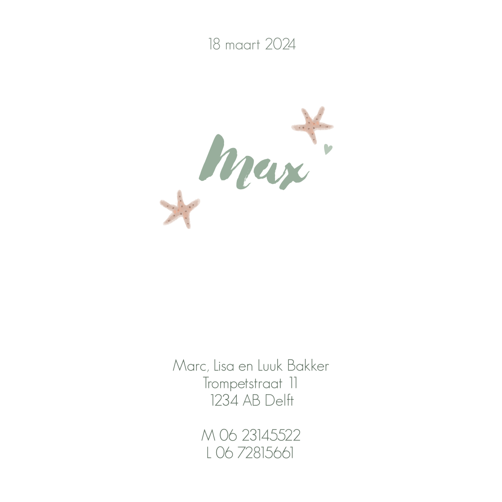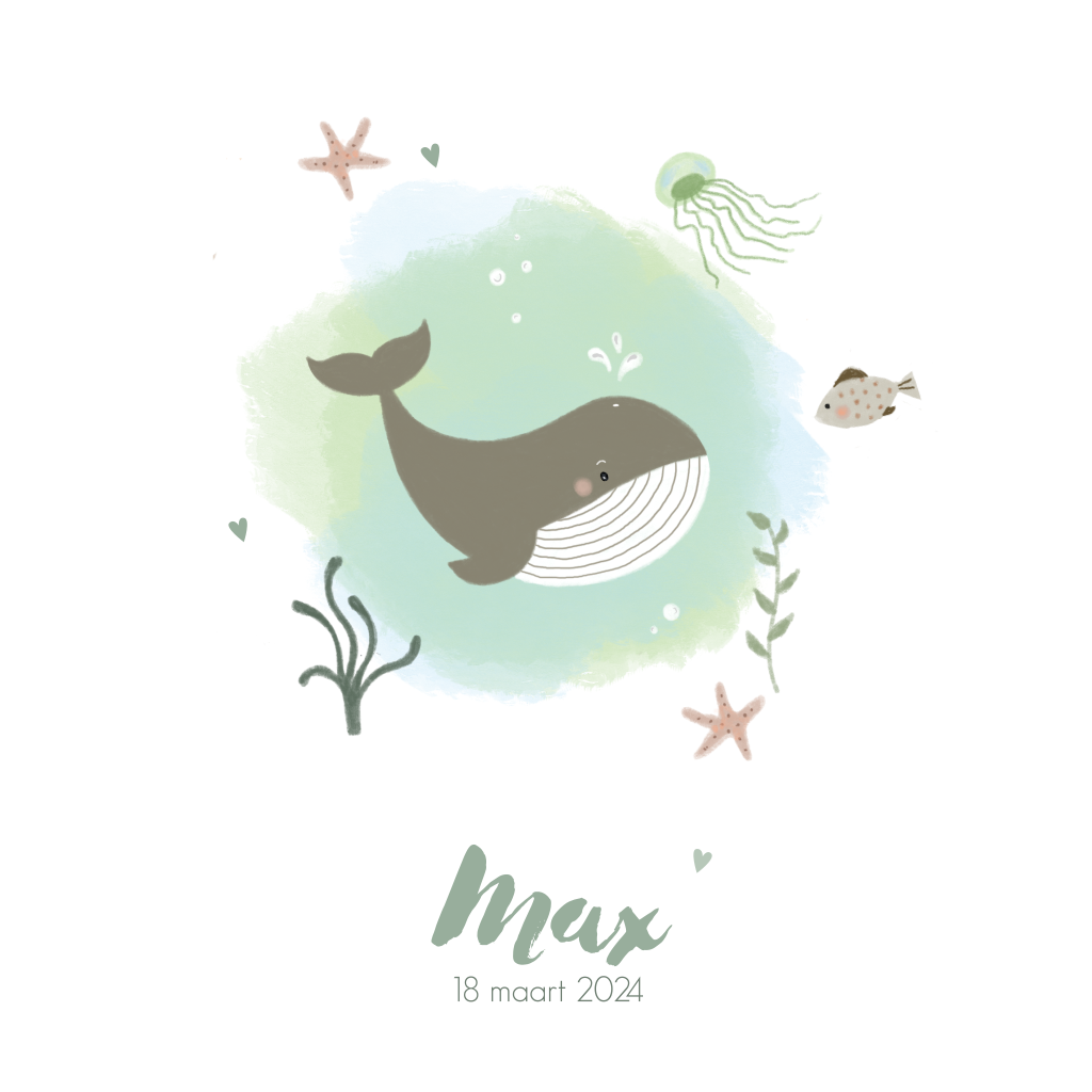 Een hip geboortekaartje voor een jongen met walvis, zeesterren, kwal, vis en waterplanten. (22056)