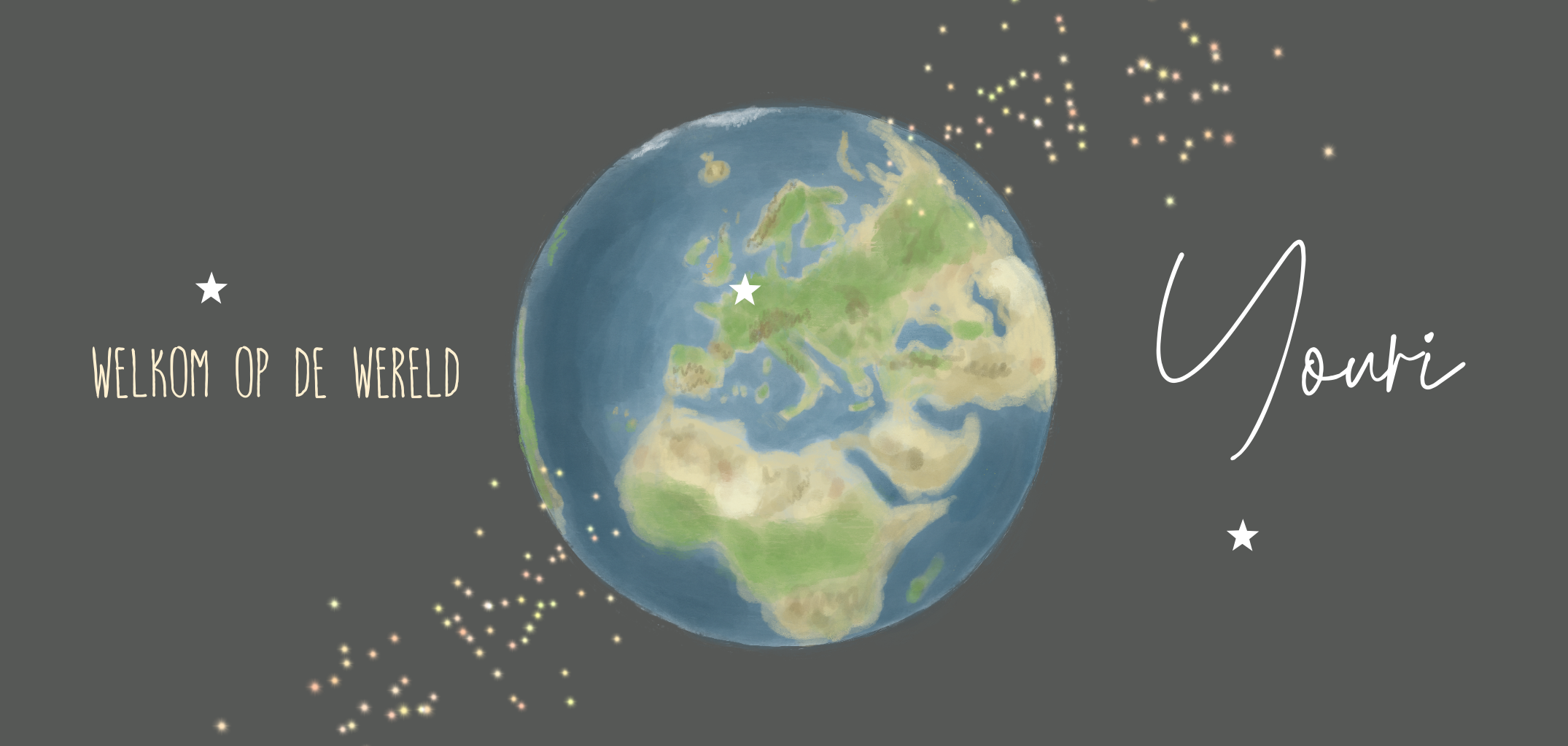 Een hip geboortekaartje voor een jongen met een wereldbol. De sterren en de naam zijn gedrukt in goudfolie. (23798)