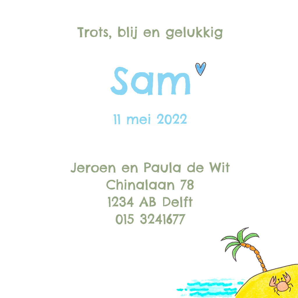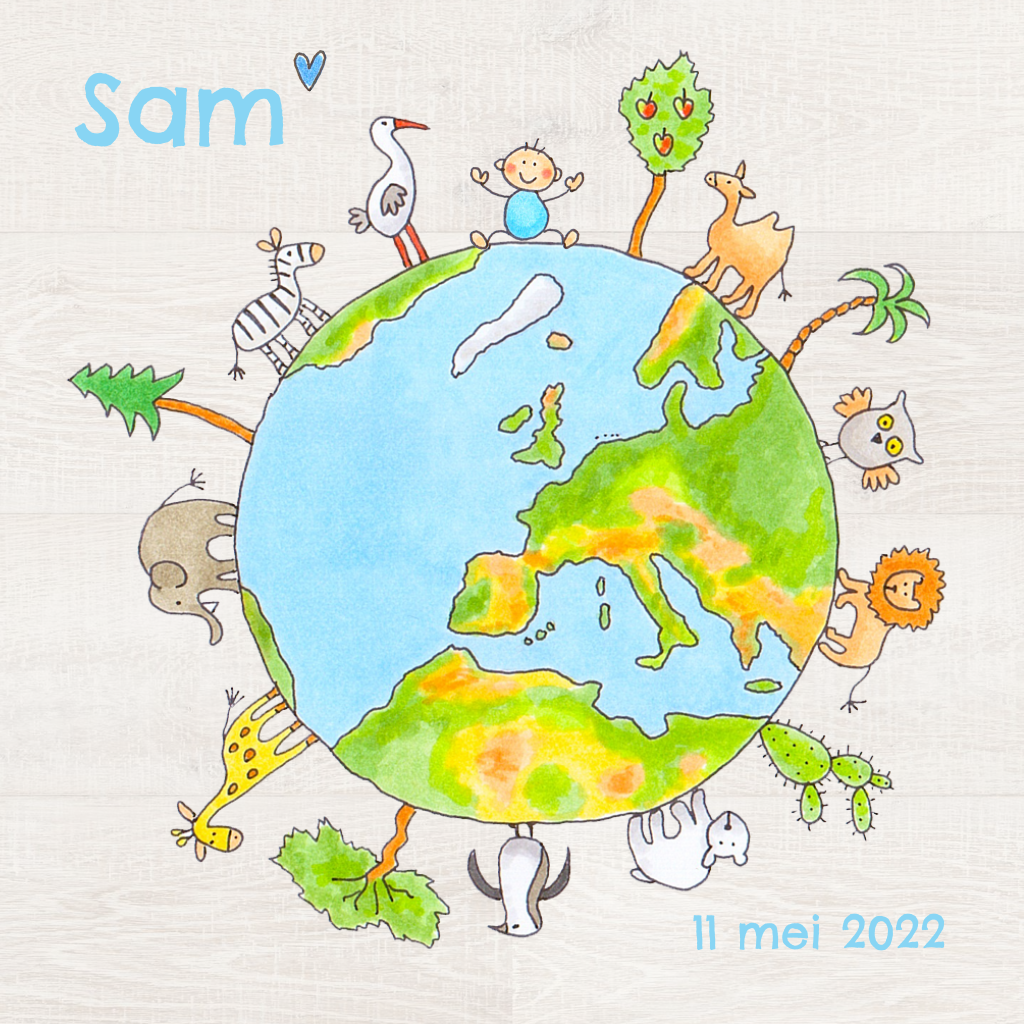 Een vrolijk, getekend geboortekaartje voor een jongen met een wereldbol, dieren en bomen op een hout print achtergrond. (5417)