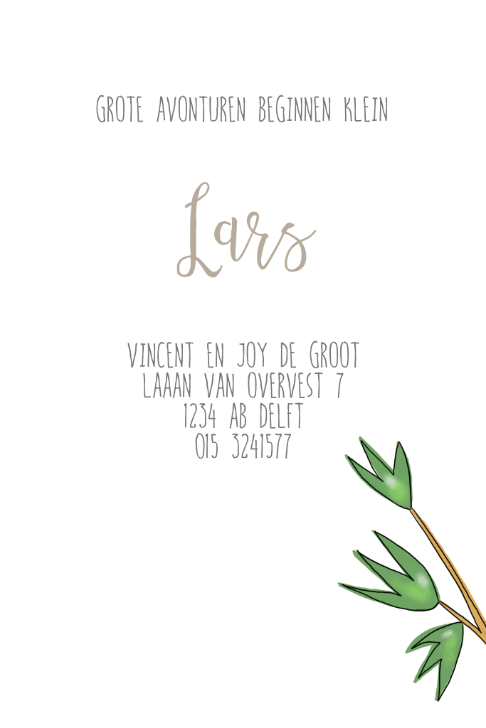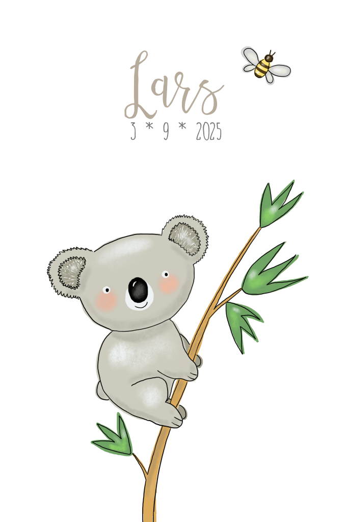 Een fris geboortekaartje met een schattige koala, bijtje en bladeren. Het geboortekaartje is naar wens aan te passen in onze kaartenmaker. (7478)