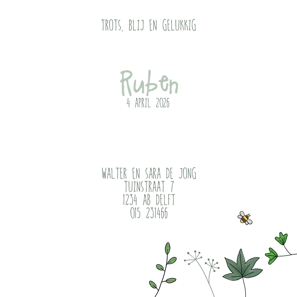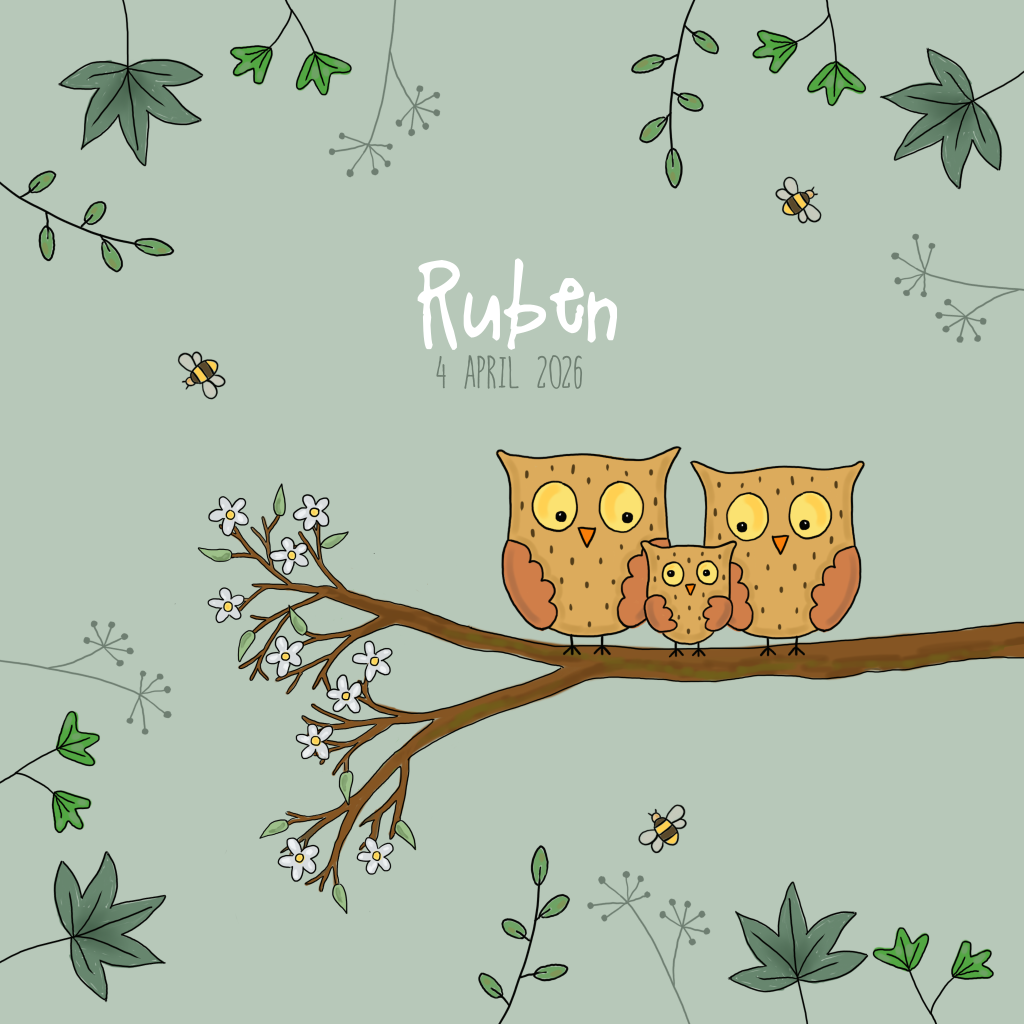 En lief lente geboortekaartje voor een jongen met drie uilen op een tak met witte bloesem. (20854)